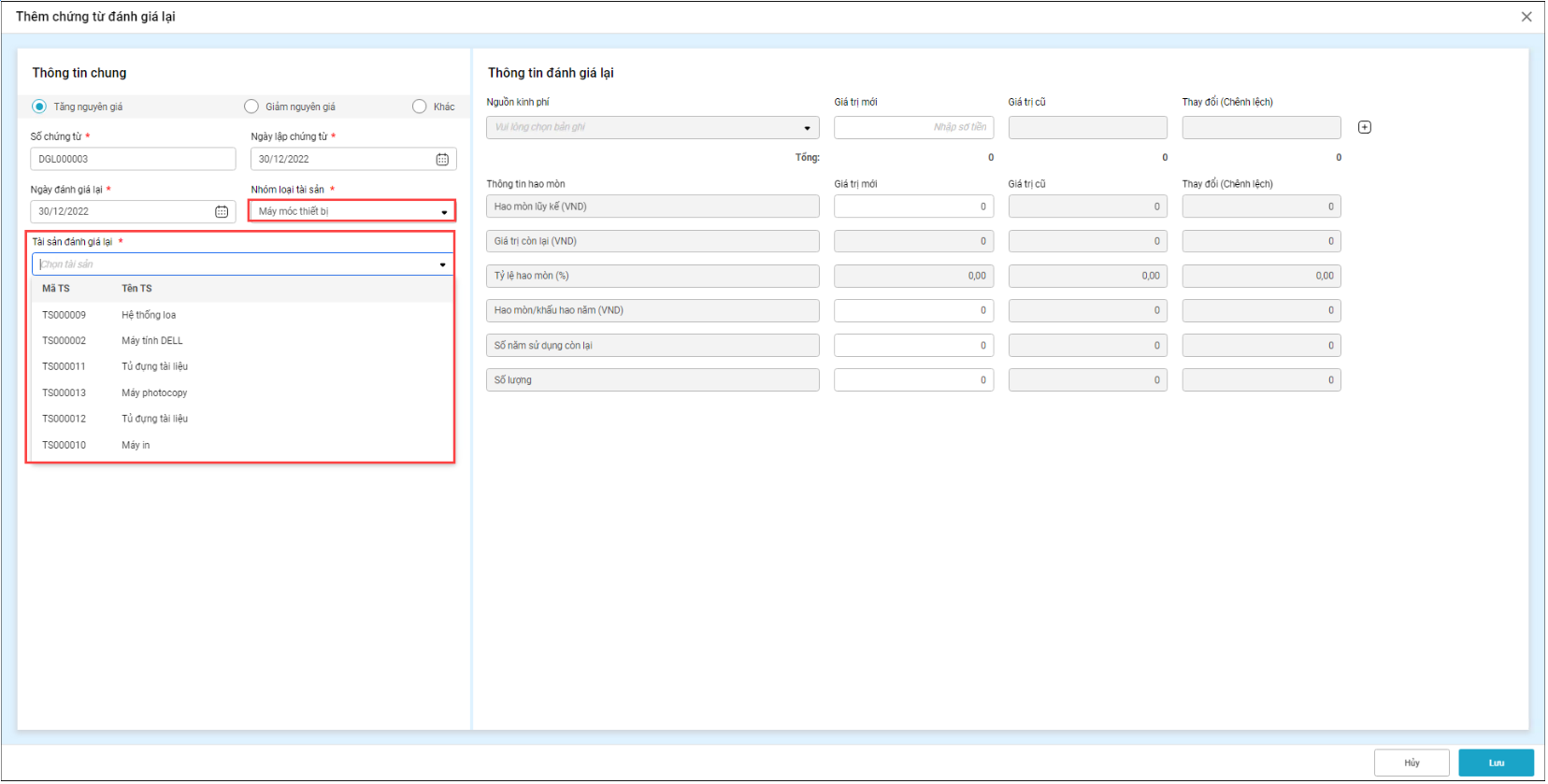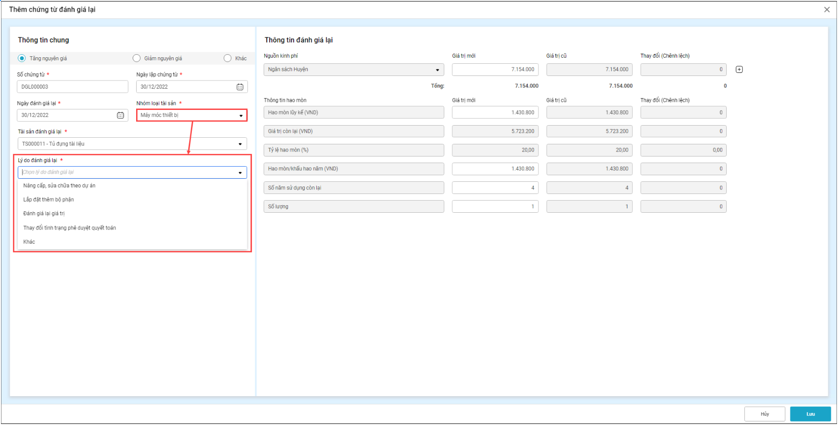 Ví dụ: Chọn nhóm loại tài sản Máy móc thiết bị => Lý do đánh giá lại bao gồm: Nâng cấp, sửa chữa theo dự án; Lắp đặt thêm bộ phận…