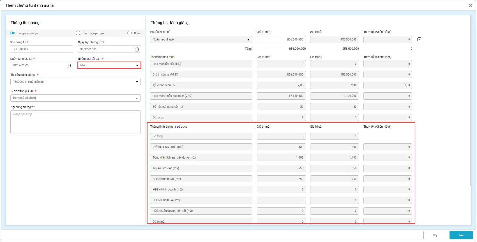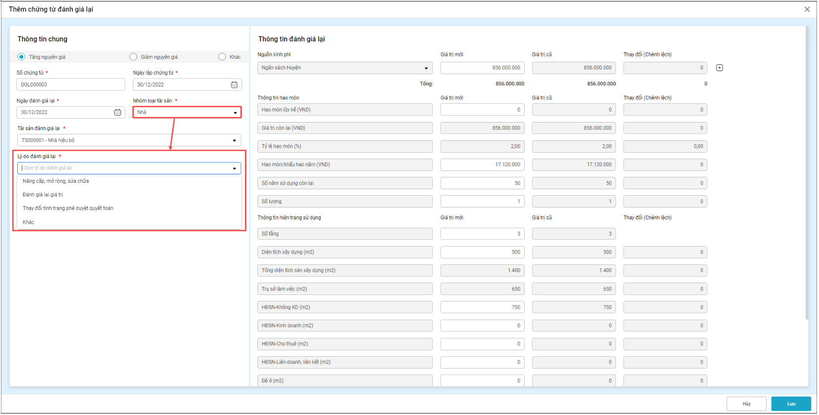 Chọn nhóm loại tài sản Nhà => Lý do đánh giá lại bao gồm: Nâng cấp, mở rộng, sửa chữa; Đánh giá lại giá trị…
