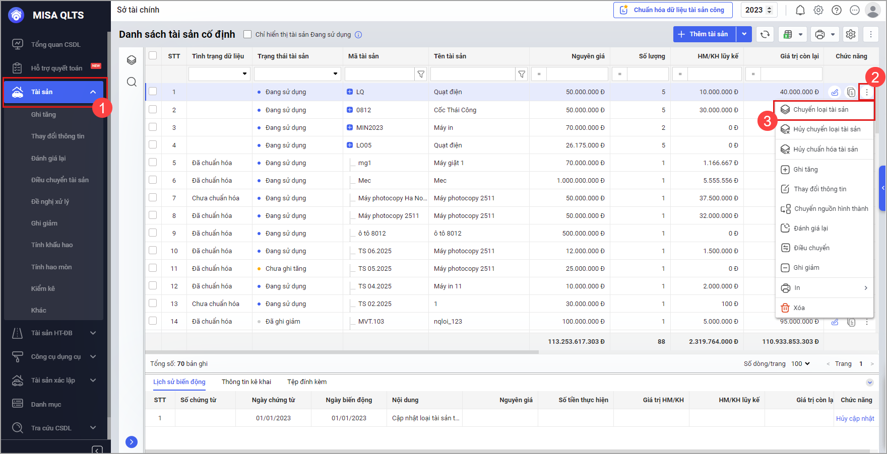 Bước 2: Chọn tài sản cần chuyển loại