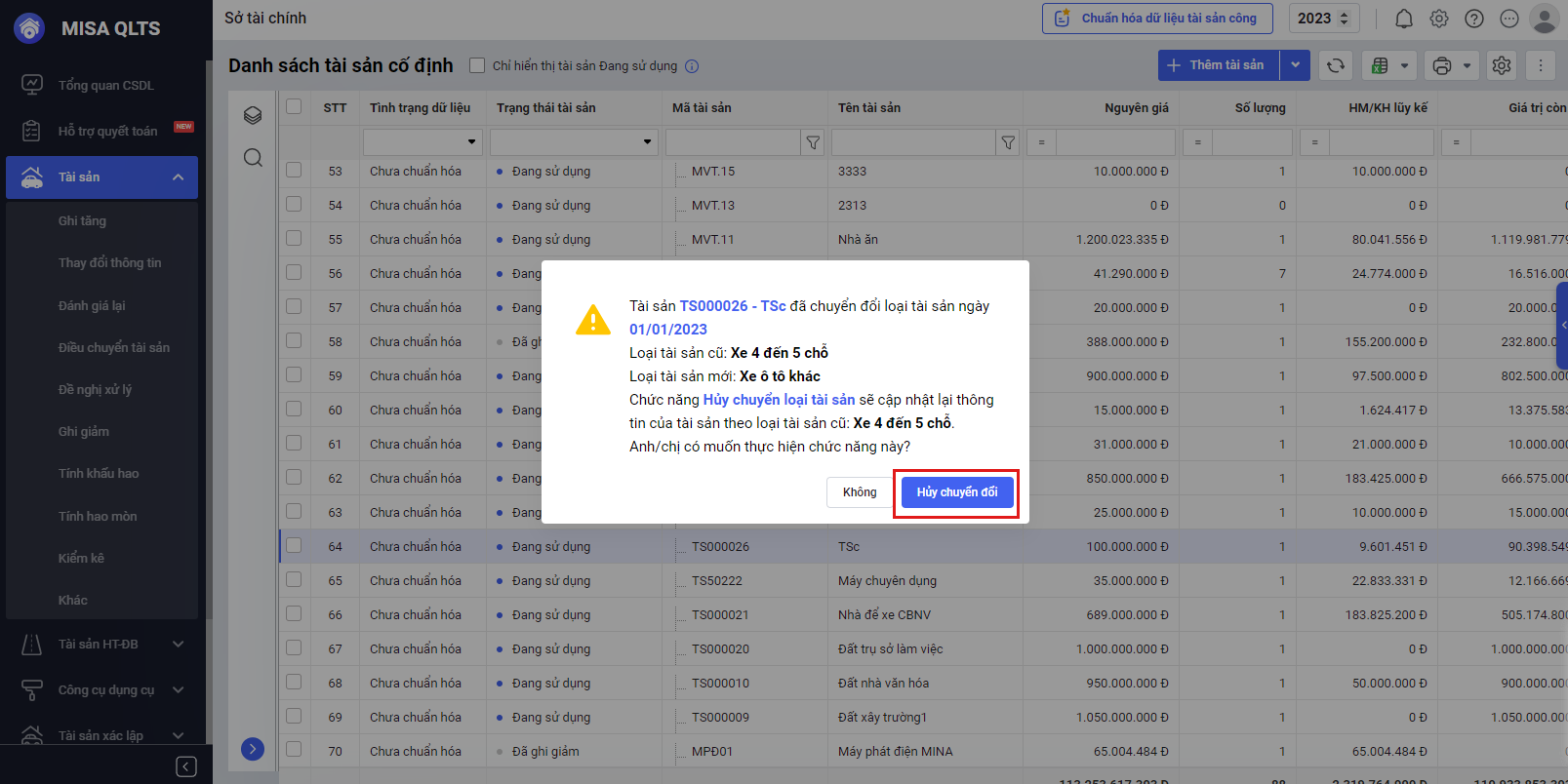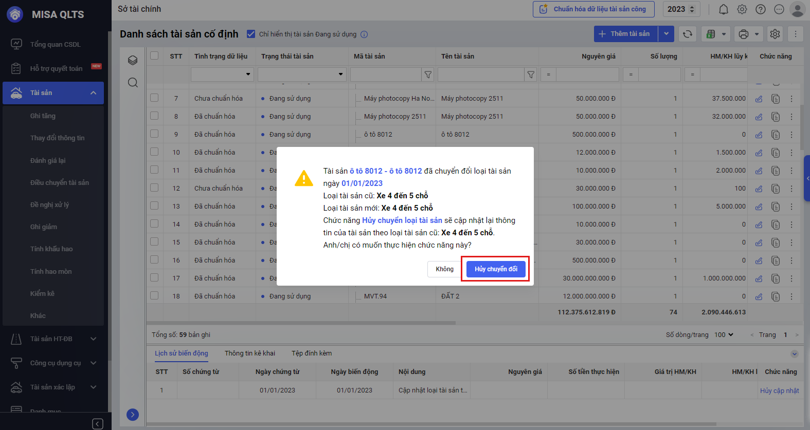Bước 3: Anh/chị chọn Hủy chuyển đổi. Sau khi hủy, phần mềm sẽ cập nhật lại thông tin tài sản theo loại tài sản cũ trước khi chuyển đổi, sau đó có thể thực hiện chuyển loại như thông thường.