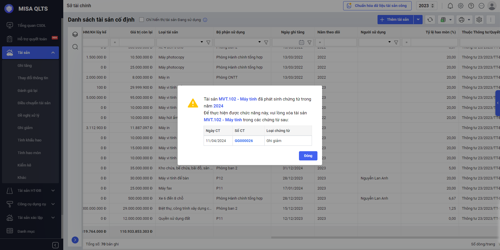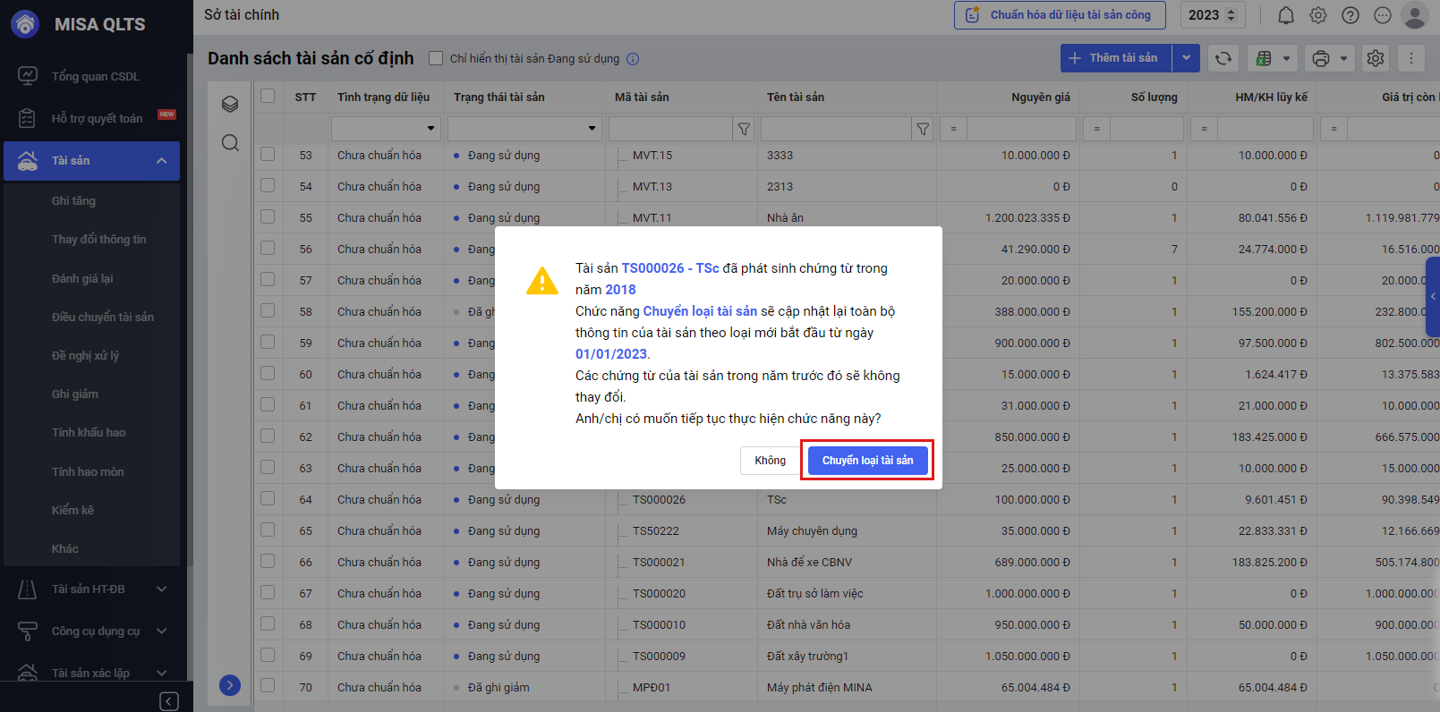 - Nếu anh/chị thực hiện chuyển loại tài sản mà tài sản đã có chứng từ phát sinh ở năm trước, phần mềm sẽ hiển thị cảnh báo.