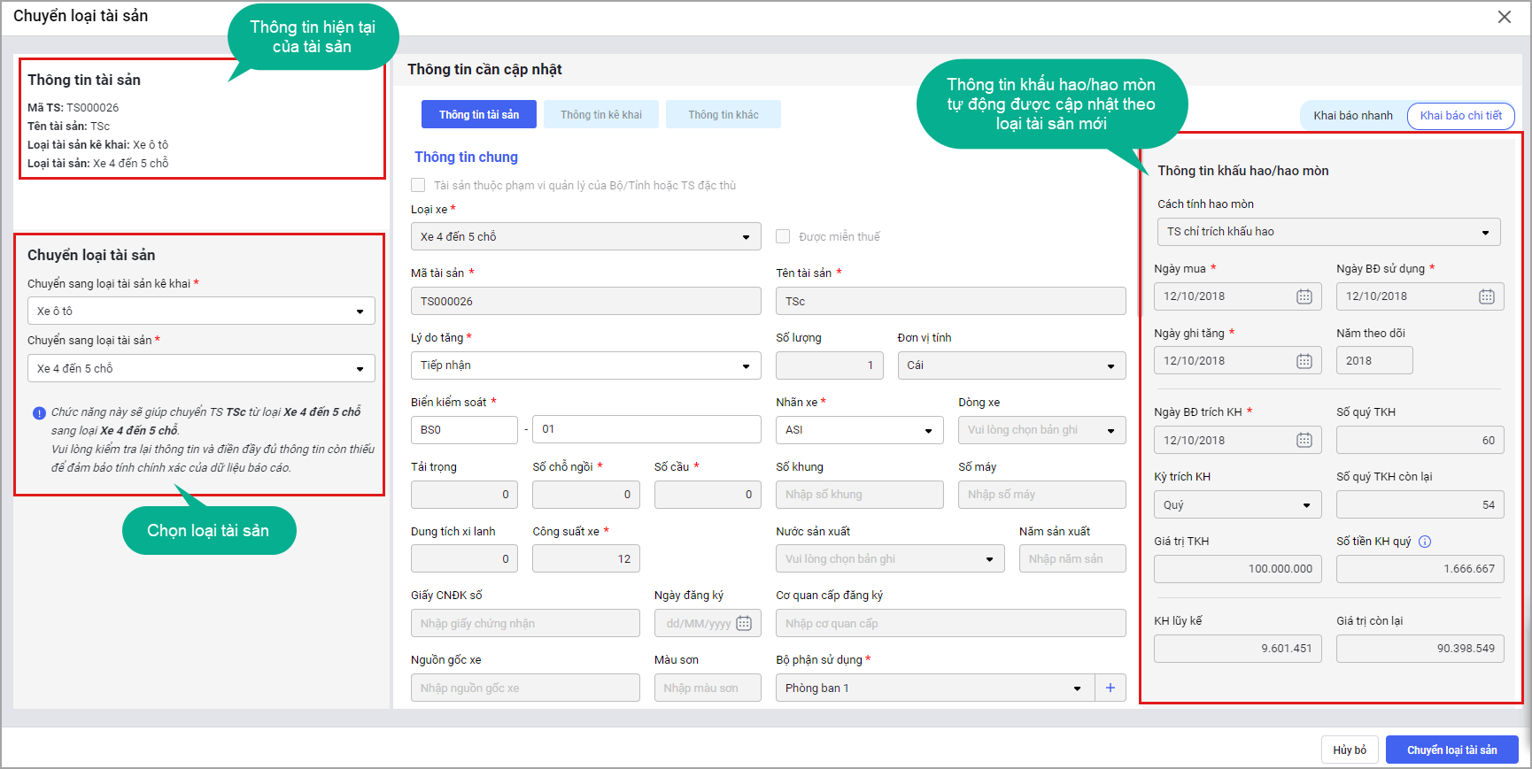 Bước 3: Khai báo thông tin thay đổi để chuyển loại tài sản: