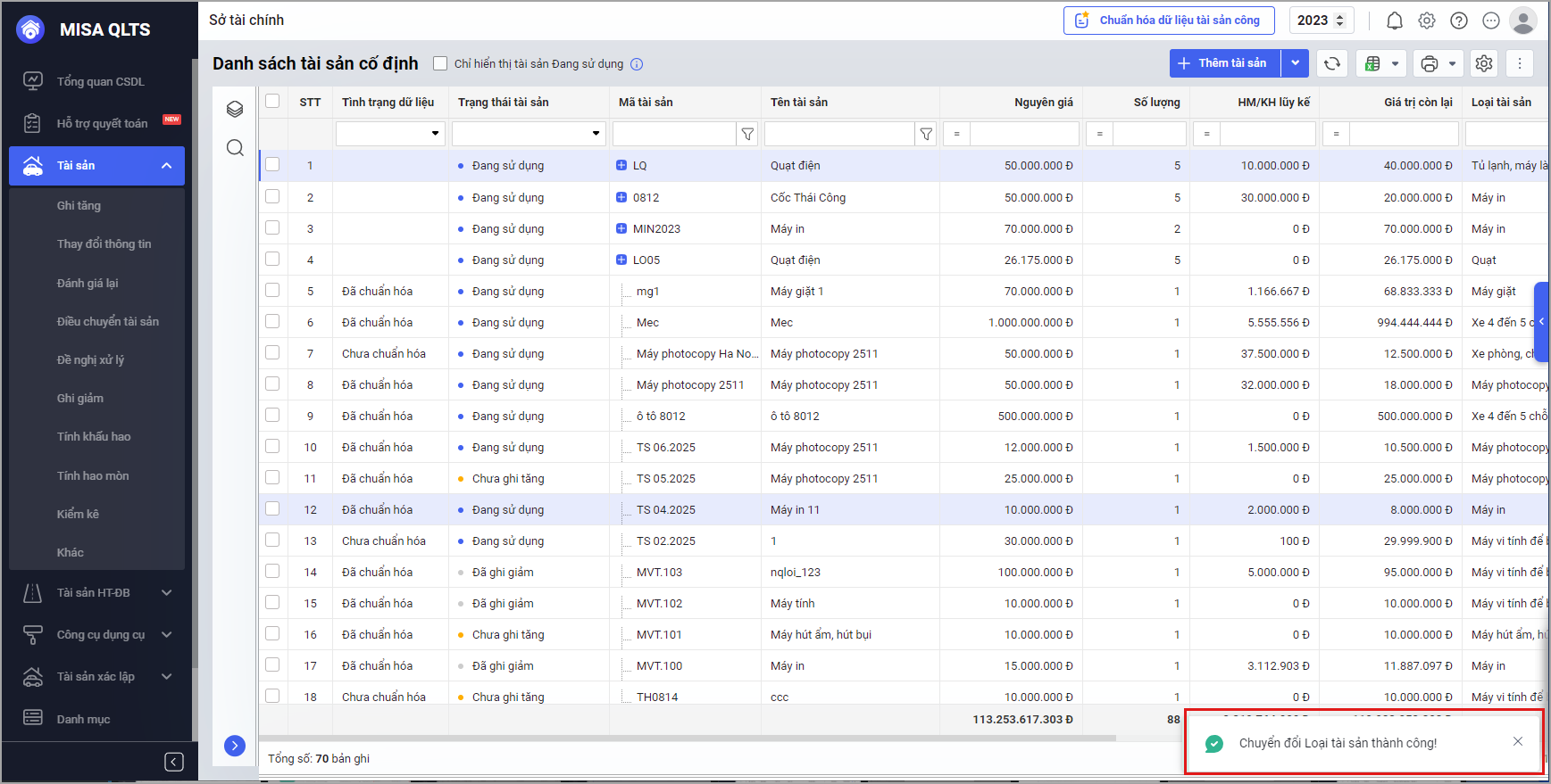 Bước 4: Sau khi điền các thông tin cần cập nhật, chọn Chuyển loại tài sản, phần mềm sẽ thông báo Chuyển đổi loại tài sản thành công.