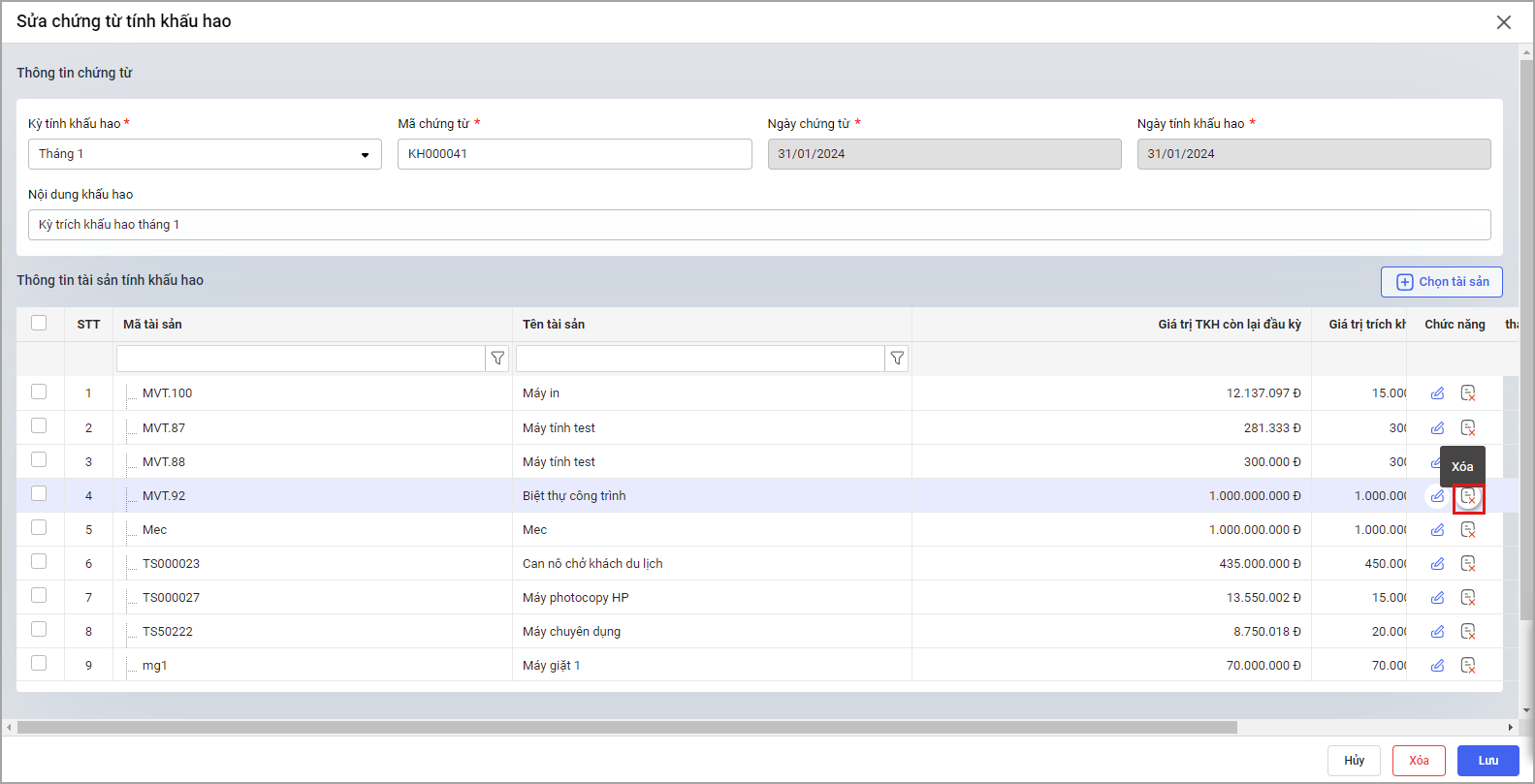 - Trường hợp chứng từ có nhiều tài sản, anh/chị xóa tài sản đó trong các chứng từ phát sinh.