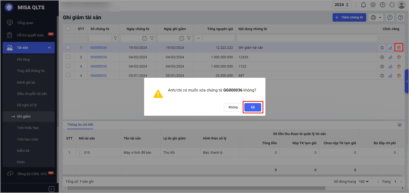 - Trường hợp chứng từ chỉ có một tài sản, chọn Xóa chứng từ tại Danh sách chứng từ tương ứng.