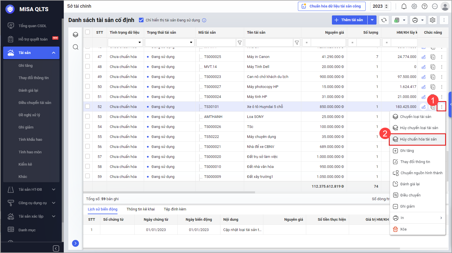 - Trường hợp tài sản đã chuẩn hóa dữ liệu tài sản anh/chị chọn biểu tượng tùy chọn, sau đó chọn Hủy chuẩn hóa tài sản.