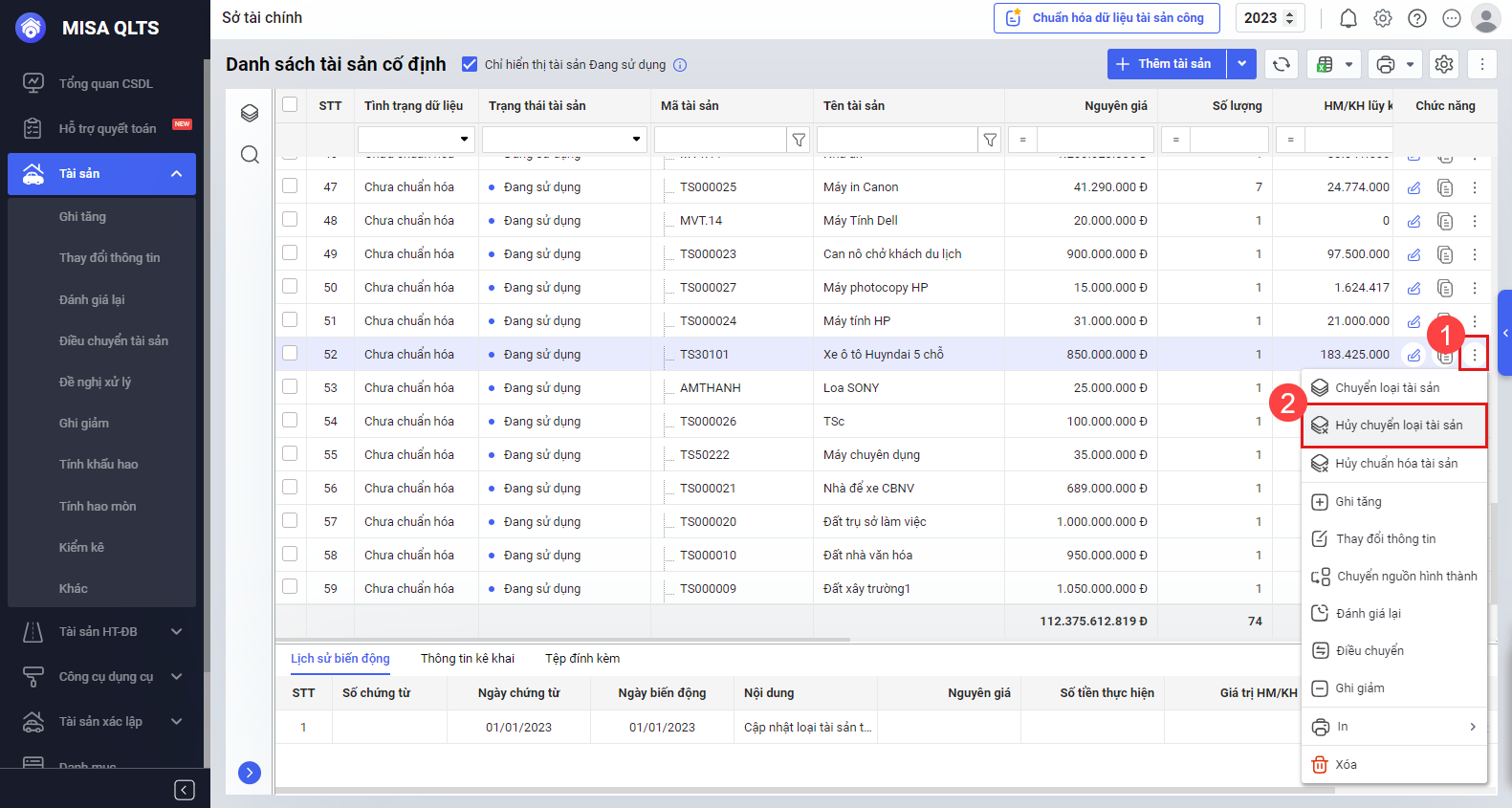 Bước 2: Nhấn nút ba chấm (⋯) cuối dòng tài sản, chọn Hủy chuyển loại tài sản.