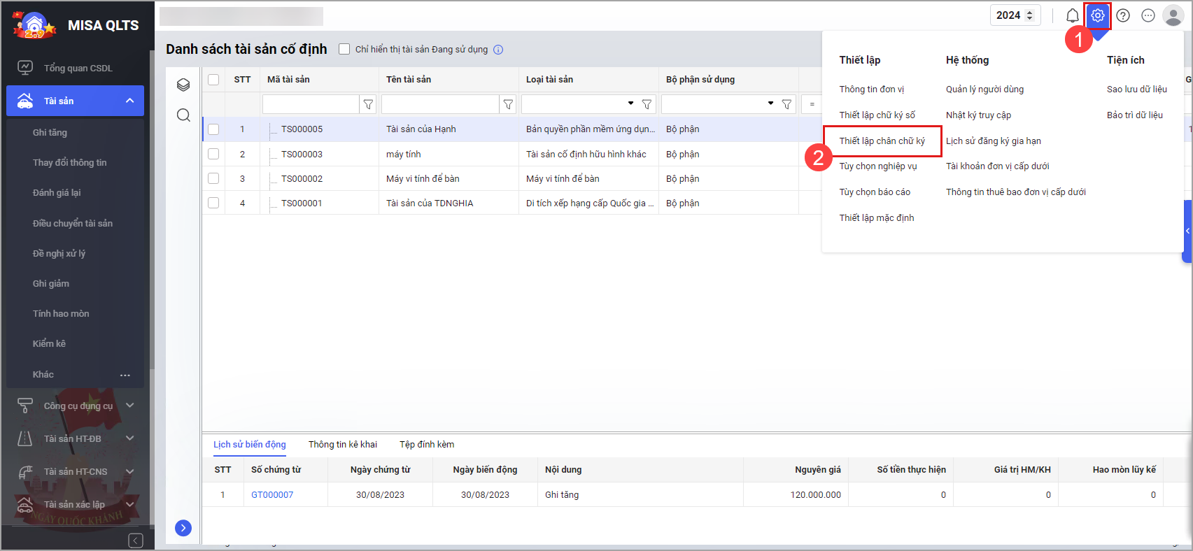 Bước 1: Nhấn vào bánh răng Hệ thống góc trên bên phải màn hình, chọn Thiết lập chân chữ ký.