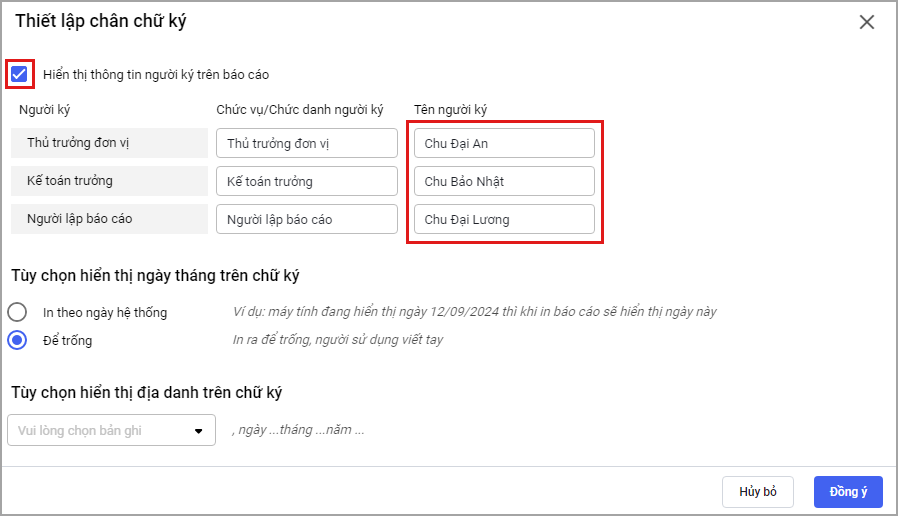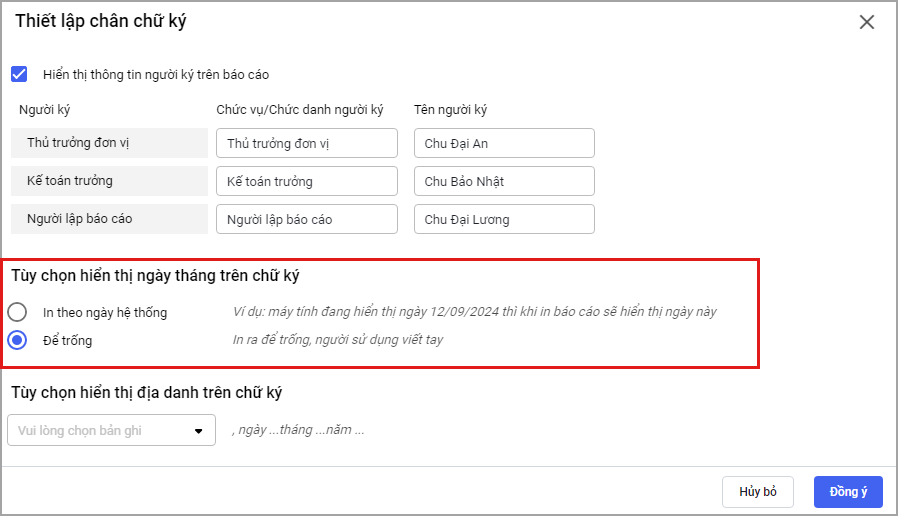 - Tại phần Tùy chọn hiển thị ngày tháng trên chữ ký, có thể tùy chọn in theo ngày hệ thống, chọn khi in báo cáo hoặc để trống ngày tháng: