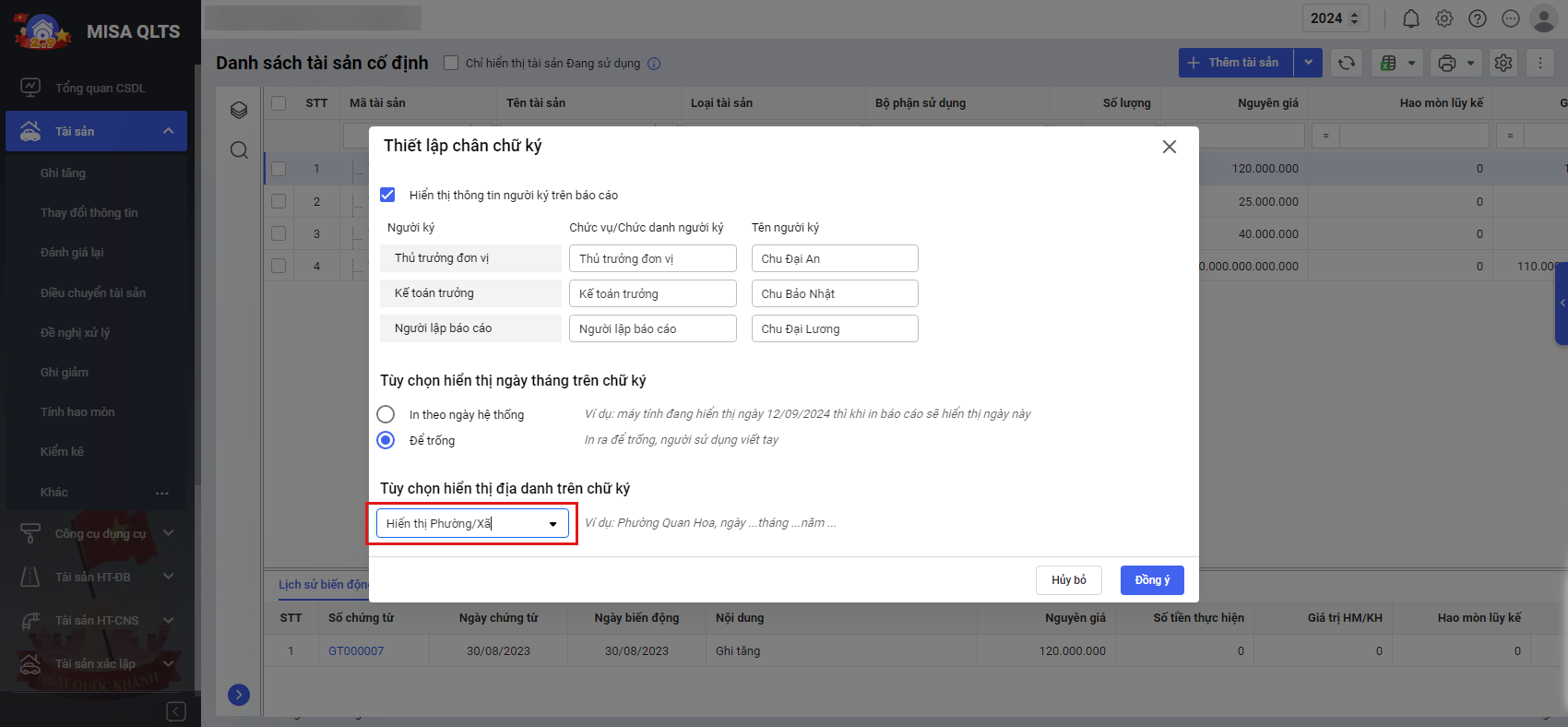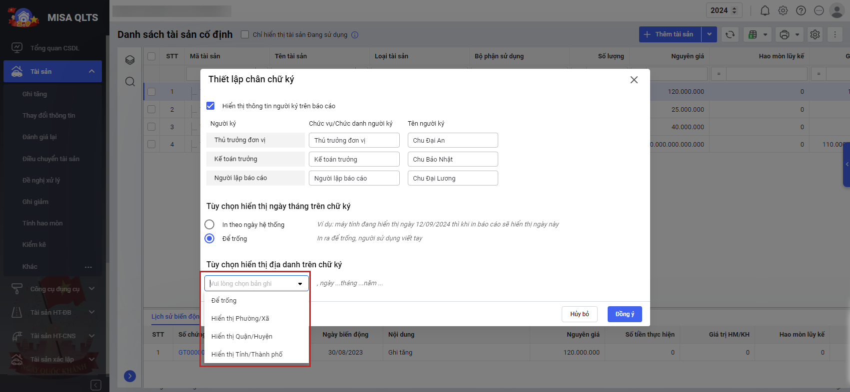 - Tại phần Tùy chọn hiển thị địa danh trên chữ ký, có thể tùy chọn để trống hoặc hiển thị địa danh theo xã/phường, quận/huyện, tỉnh/thành phố.