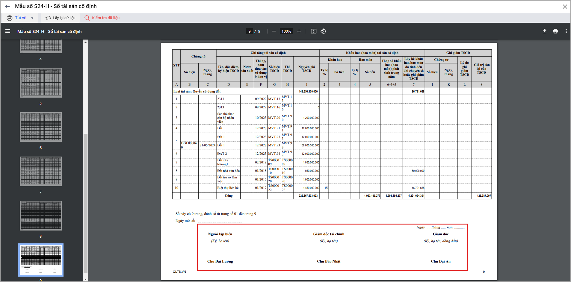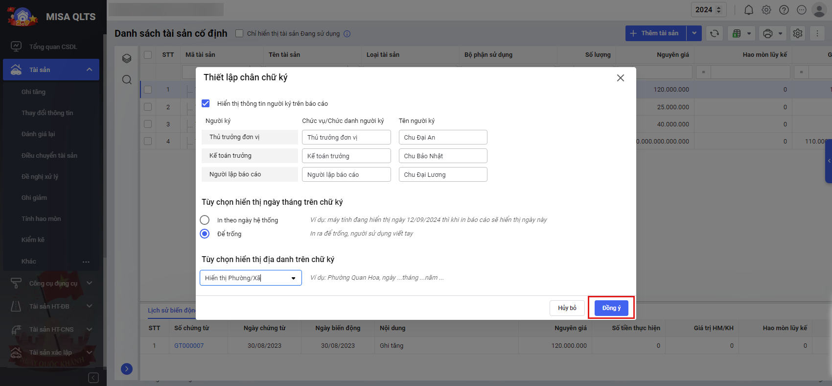 Tích chọn: Phần mềm cho phép chỉnh sửa Chức vụ/Chức danh và Tên người ký. Phần chân chữ ký trên báo cáo sẽ hiển thị vai trò và tên người ký tương ứng theo các vai trò có sẵn của mẫu báo cáo.