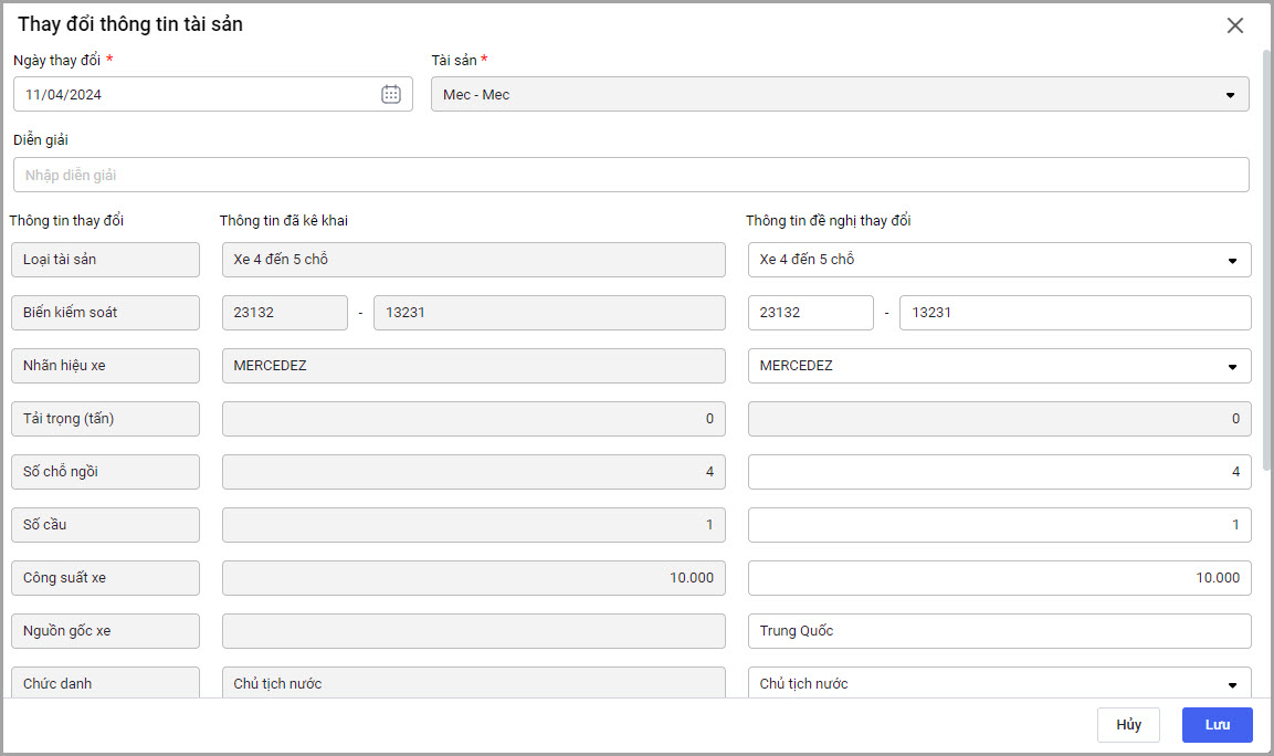 • Nhập các Thông tin đề nghị thay đổi như Loại tài sản, Biển kiểm soát, Nhãn hiệu xe, Số chỗ ngồi, Số cầu, Công suất xe, Hiện trạng sử dụng…