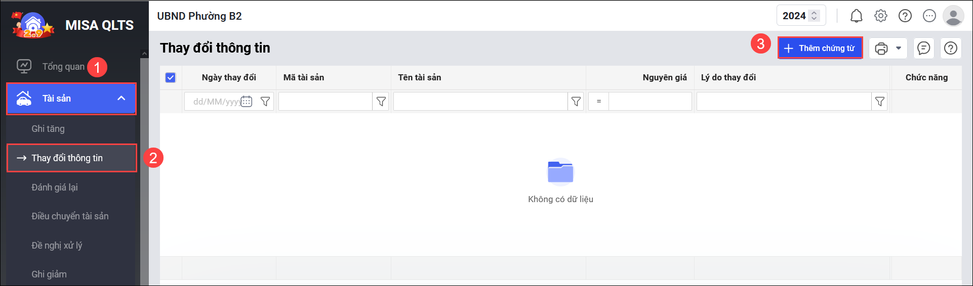 • Vào menu Tài sản\Thay đổi thông tin, nhấn Thêm chứng từ