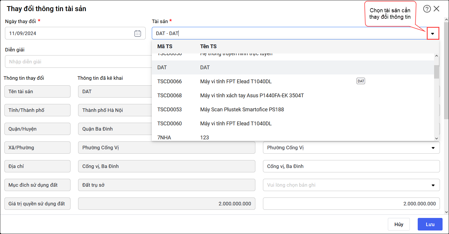 2. Các bước thực hiện thay đổi thông tin tài sản