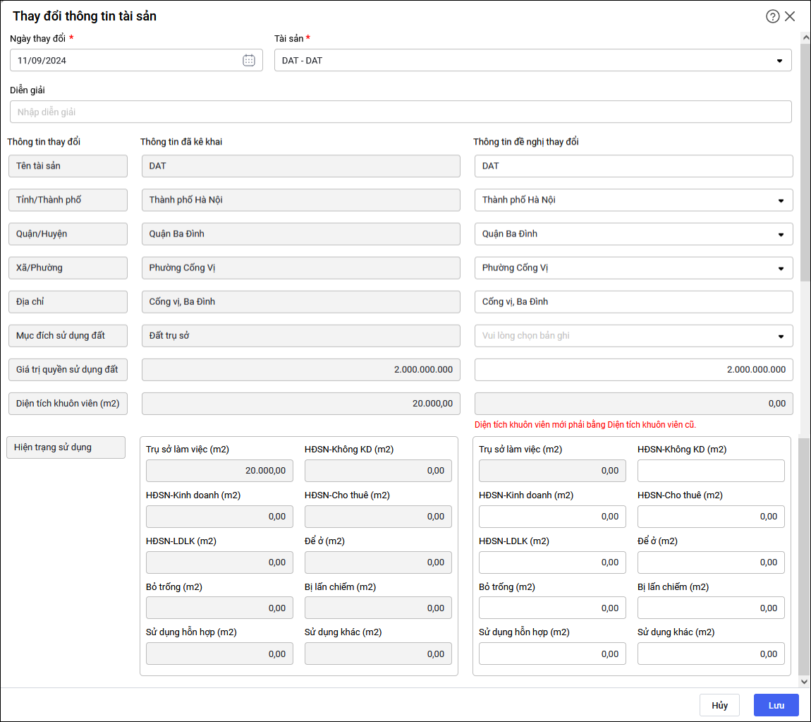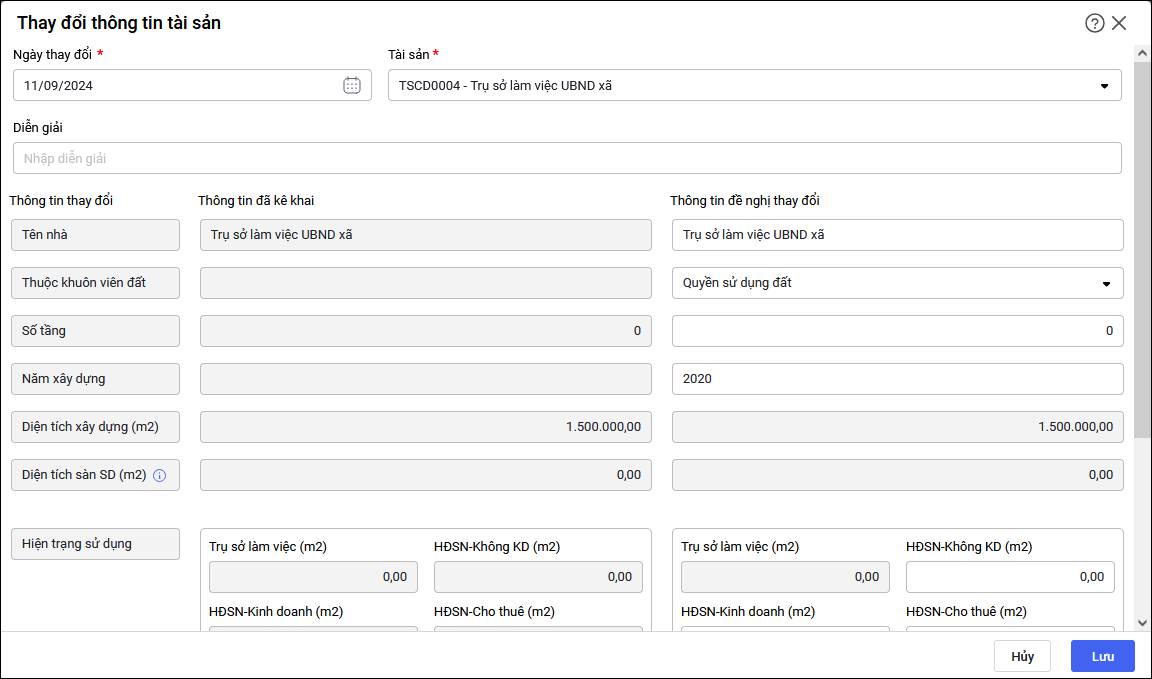 • Lưu ý: Đối với tài sản là Nhà nếu trước đây anh/chị bỏ trống thông tin diện tích sàn sử dụng thì chứng từ Thay đổi thông tin không sửa được thông tin Diện tích sàn sử dụng, cần tiến hành lập chứng từ đánh giá lại để thay đổi thông tin Diện tích sản sử dụng. Thông tin Quận/Huyện anh/chị bỏ qua không cần điền.