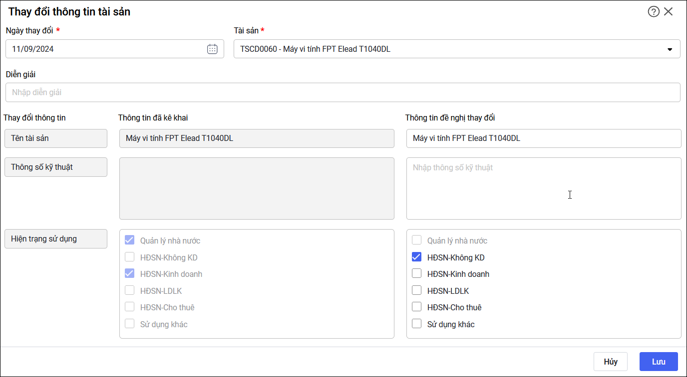 • Nhập các Thông tin đề nghị thay đổi như Tên tài sản, Thông số kỹ thuật, Hiện trạng sử dụng.