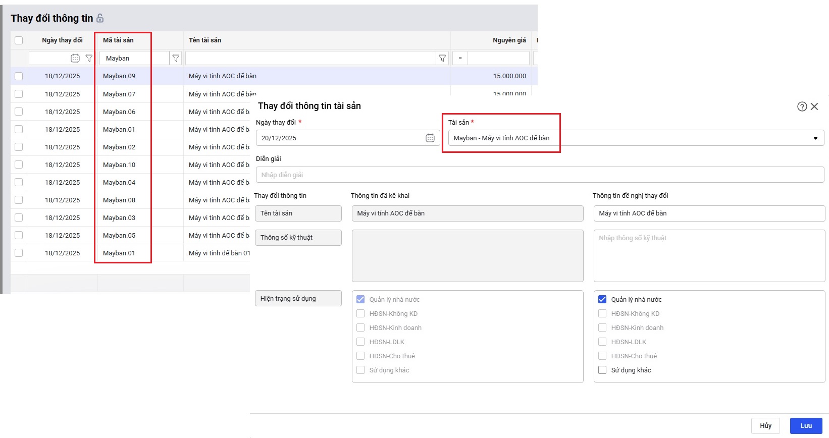 • Chọn tài sản cần thay đổi thông tin