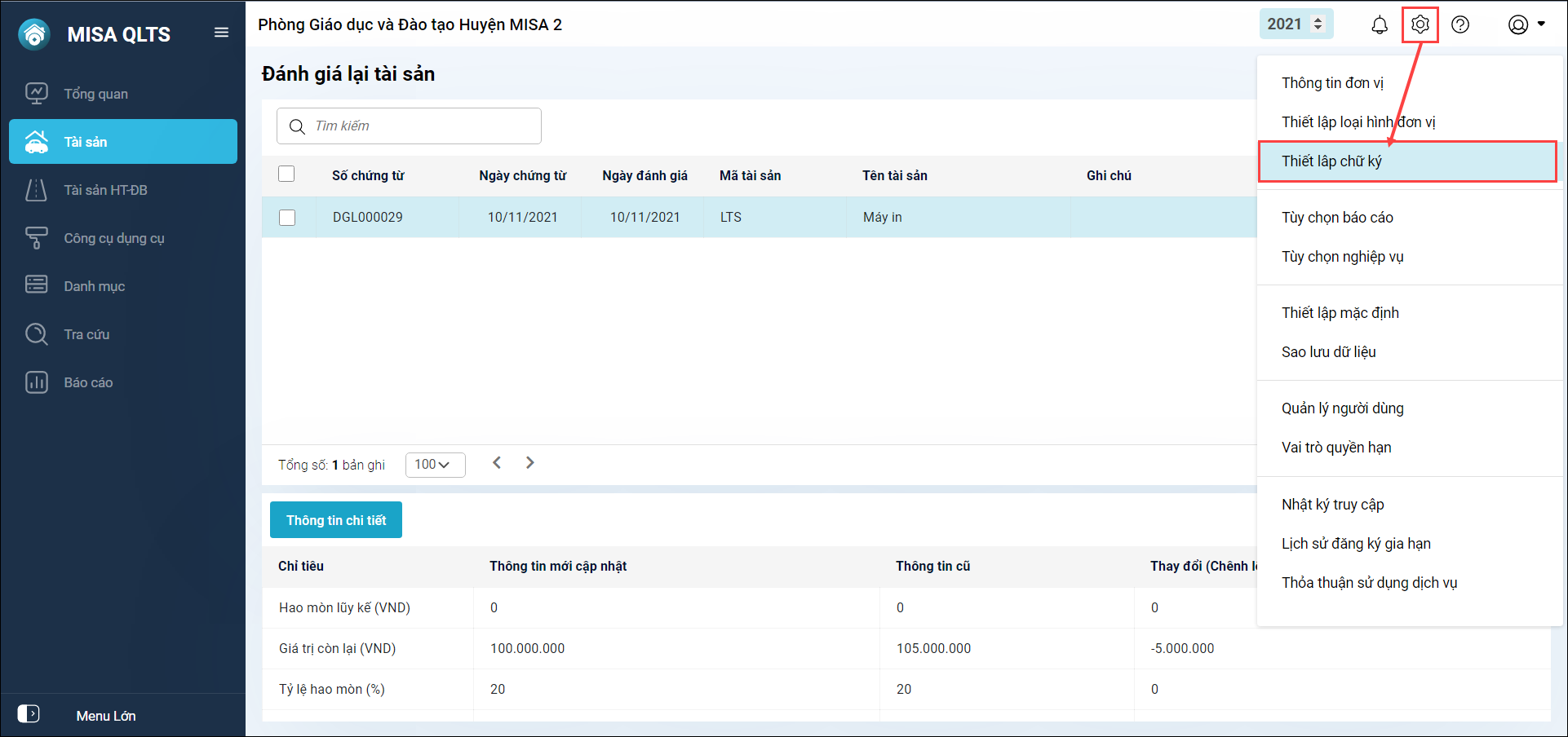 1. Nhấn vào biểu tượng Hệ thống tại góc trên bên phải màn hình, chọn Thiết lập chữ ký.