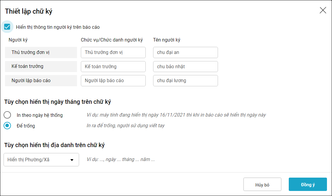 3. Tại phần Tùy chọn hiển thị ngày tháng trên chữ ký, có thể tùy chọn in theo ngày hệ thống, chọn khi in báo cáo hoặc để trống ngày tháng: