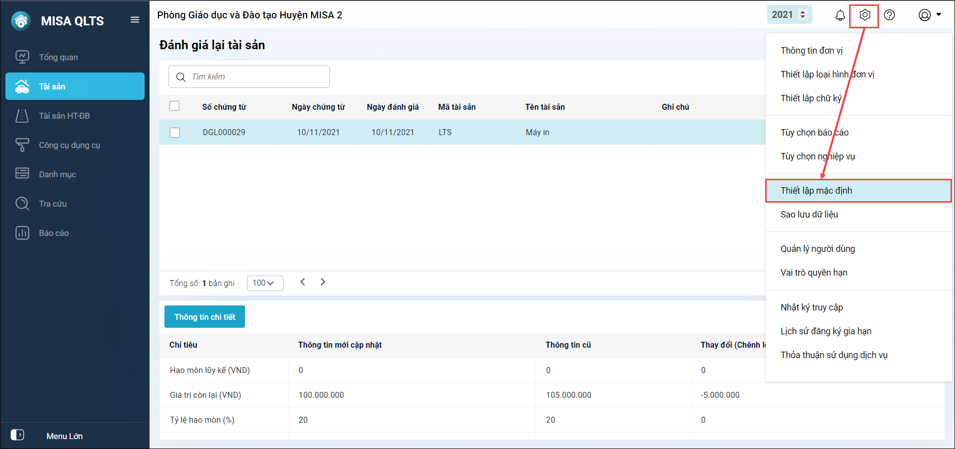 1. Nhấn vào biểu tượng Hệ thống tại góc trên bên phải màn hình, chọn Thiết lập mặc định.