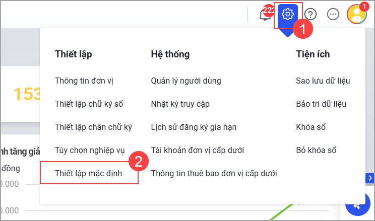 Nhấn vào biểu tượng Hệ thống (hình bánh răng cưa) tại góc trên bên phải màn hình, chọn Thiết lập mặc định.