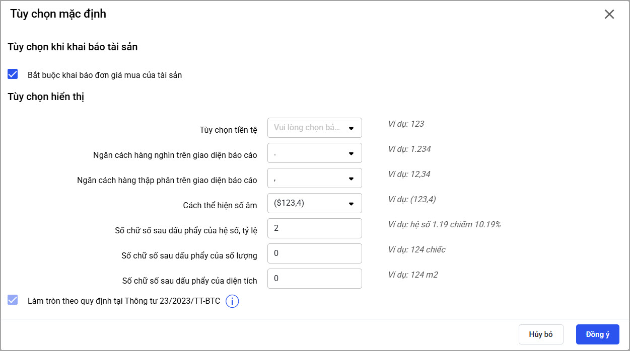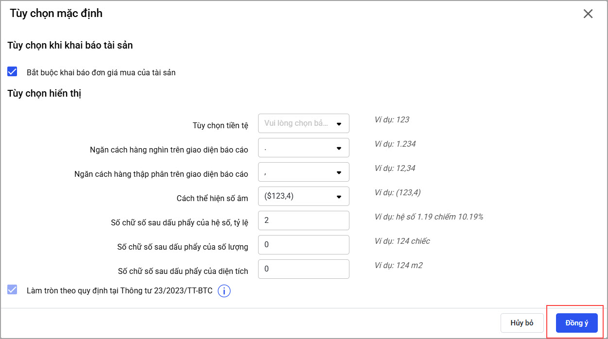- Tùy chọn tiền tệ: Chọn đơn vị tiền tệ ghi nhận tài sản trên phần mềm.