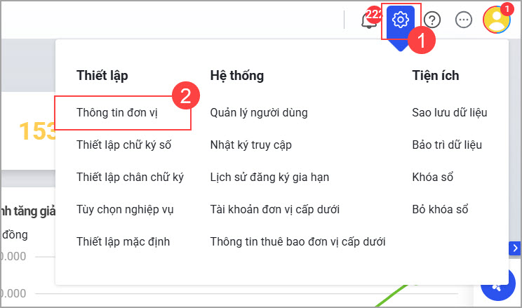 • Vào Thiết lập ⚙ \ Thông tin đơn vị.
