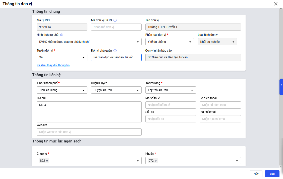 • Mã QHNS, Tên đơn vị: Phần mềm tự động lấy lên theo giấy phép sử dụng phần mềm và anh/chị không thể tự chỉnh sửa trên phần mềm. Trường hợp cần thay đổi, anh/chị vui lòng liên hệ MISA để được hỗ trợ cập nhật.