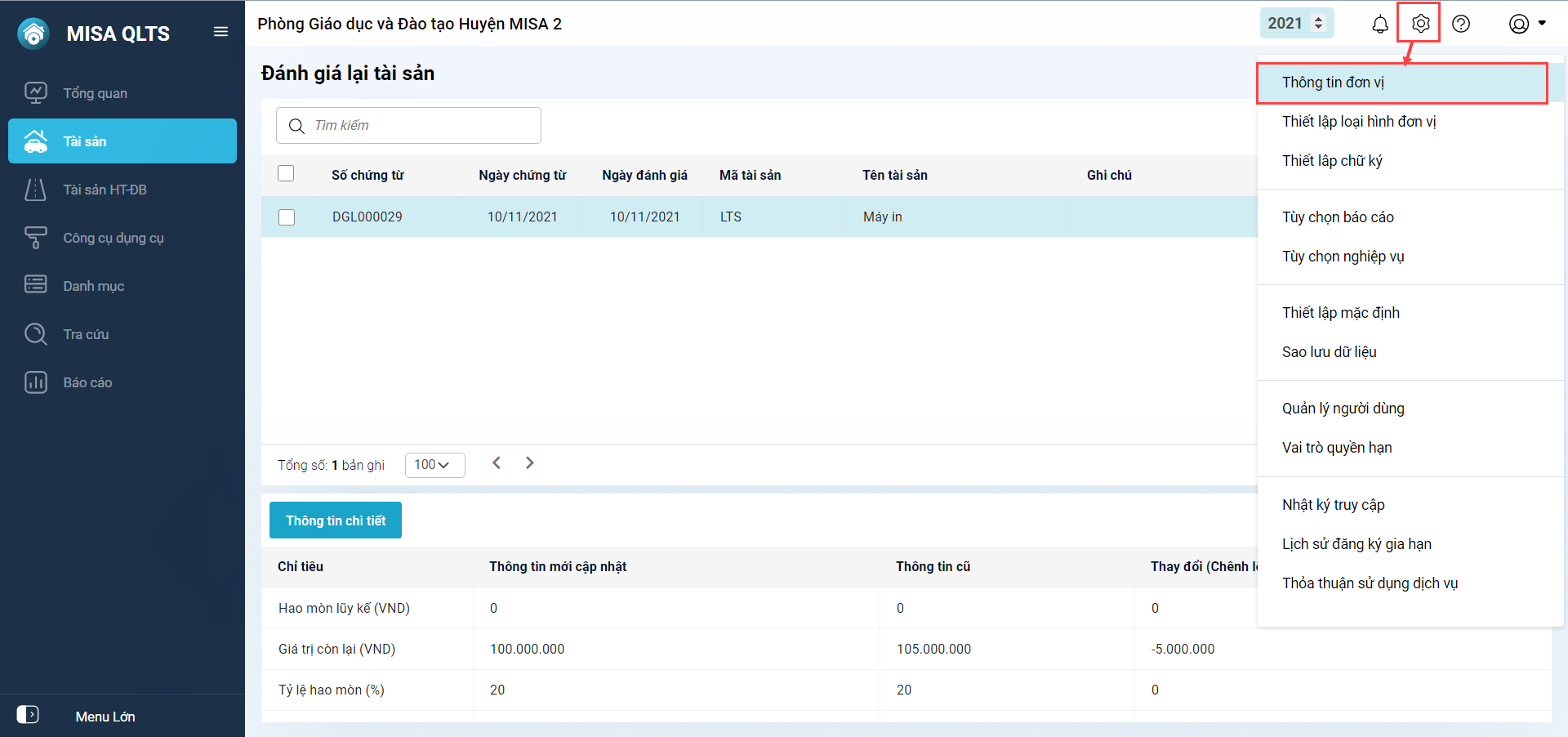1. Nhấn vào biểu tượng Hệ thống tại góc trên bên phải màn hình, chọn Thông tin đơn vị.