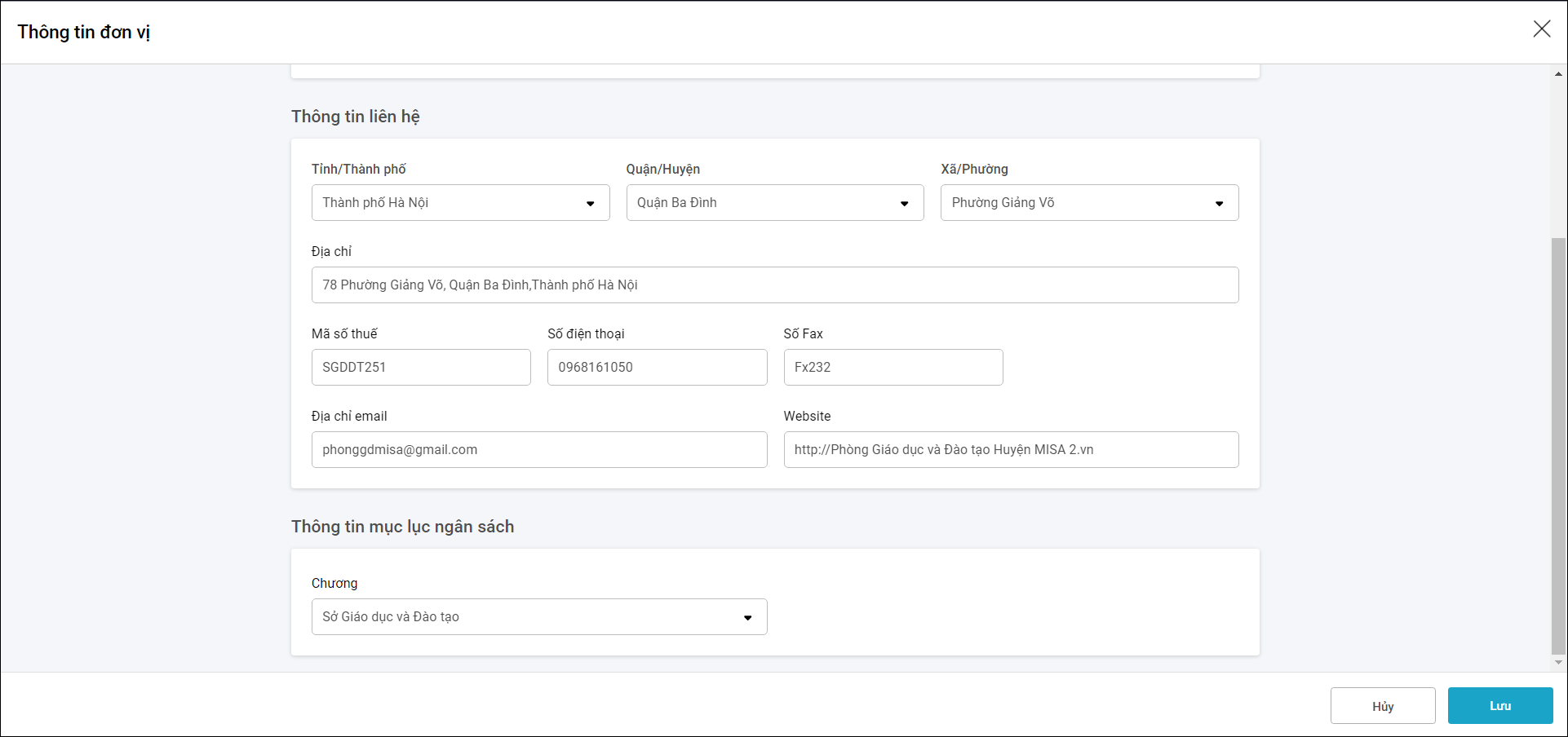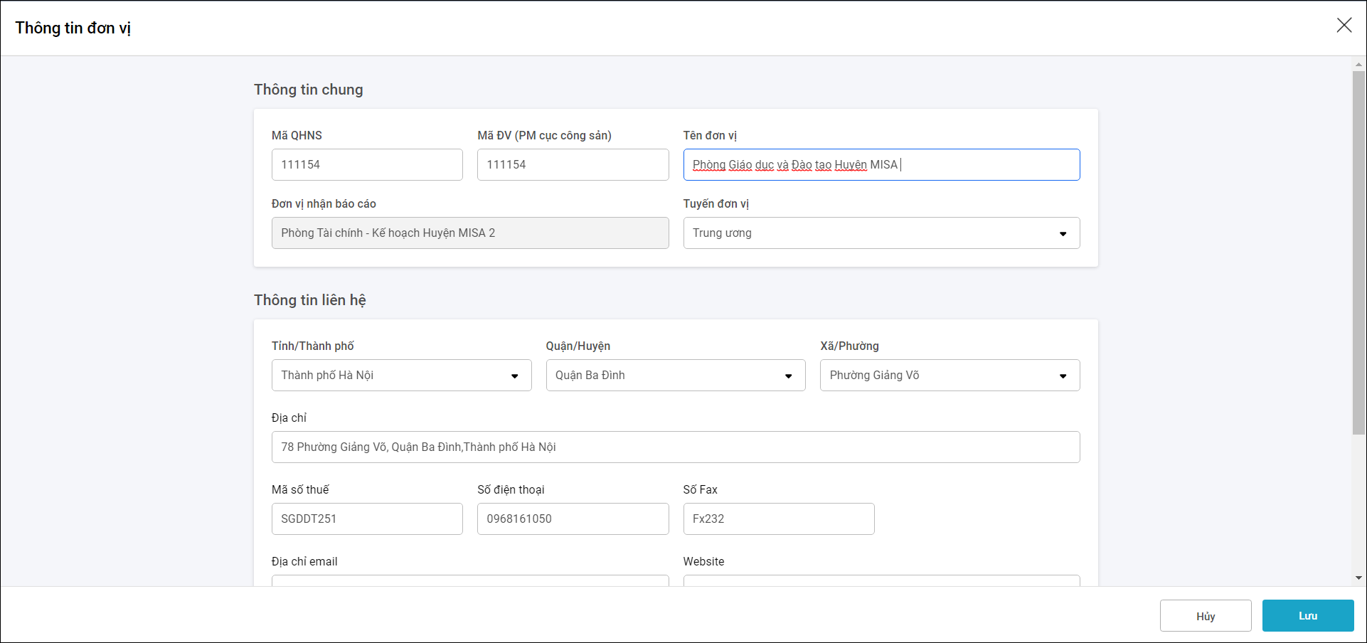2. Tại phần Thông tin chung: Khai báo các thông tin chung nhưu Mã QHNS, Tên đơn vị, Tuyến đơn vị…