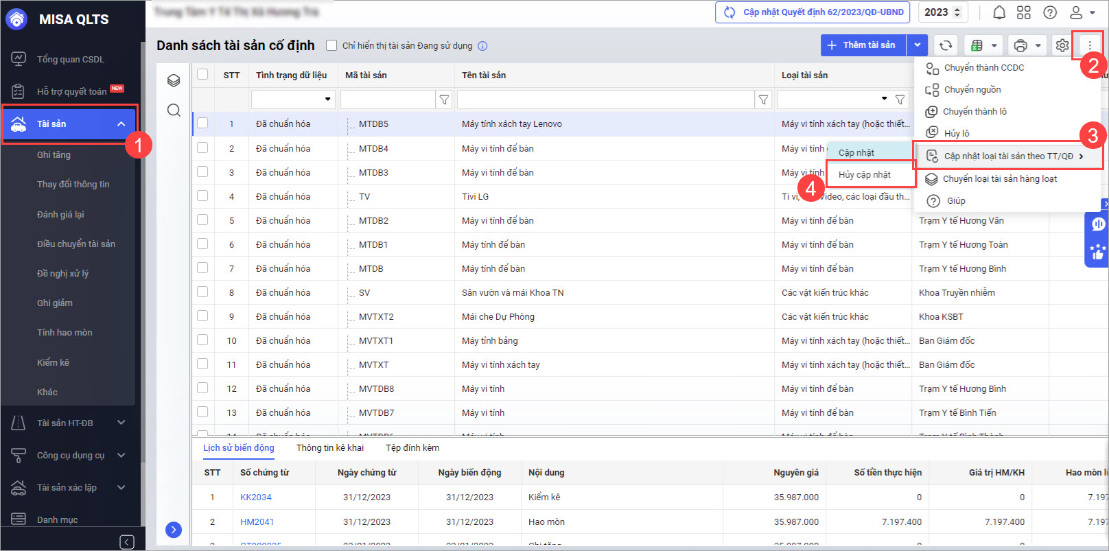 Hủy chuyển loại tài sản: Trong trường hợp thực hiện cập nhật tài sản theo Quyết định 62/2023/QĐ-UBND có sai sót, tính năng Hủy bỏ chuyển loại tài sản sẽ giúp lấy lại thông tin của tài sản tại thời điểm trước khi cập nhật.