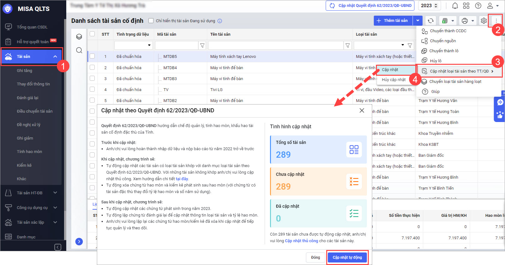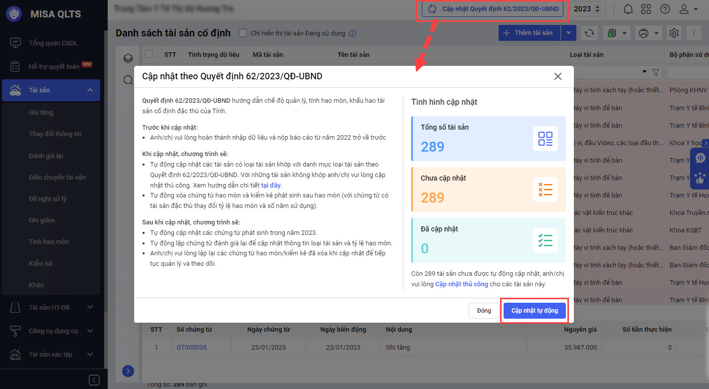 - Kể từ phiên bản R36: Quyết định 62/2023/QĐ-UBND để quản lý theo đúng quy định của UBND tỉnh Thừa Thiên Huế. Bổ sung thêm chức năng “Cập nhật Quyết định 62/2023/QĐ-UBND” để anh/chị có thể cập nhật danh mục tài sản theo quyết định này.