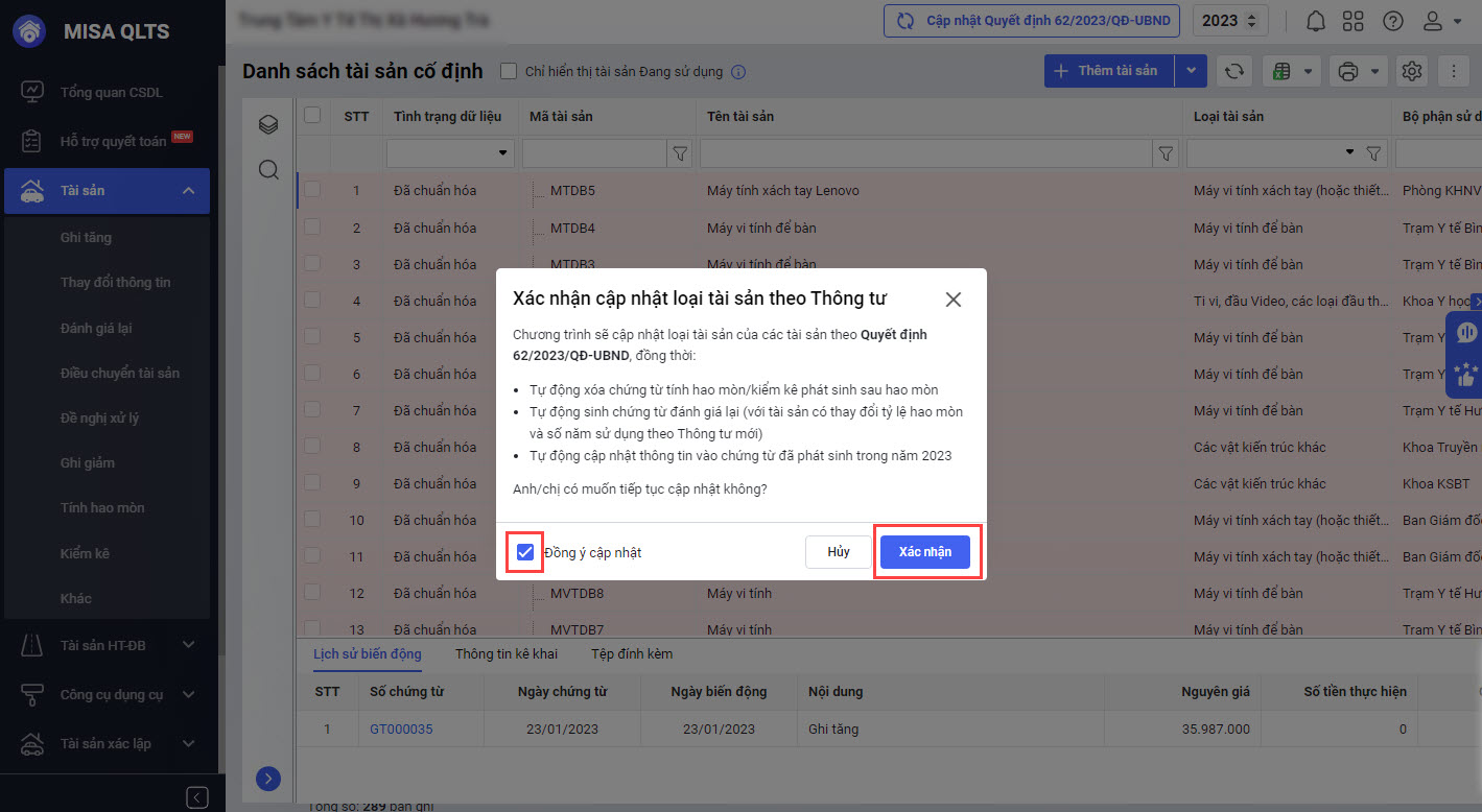 - Tích chọn Đồng ý cập nhật và chọn Xác nhận để đồng ý cập nhật tài sản theo thông tư mới.