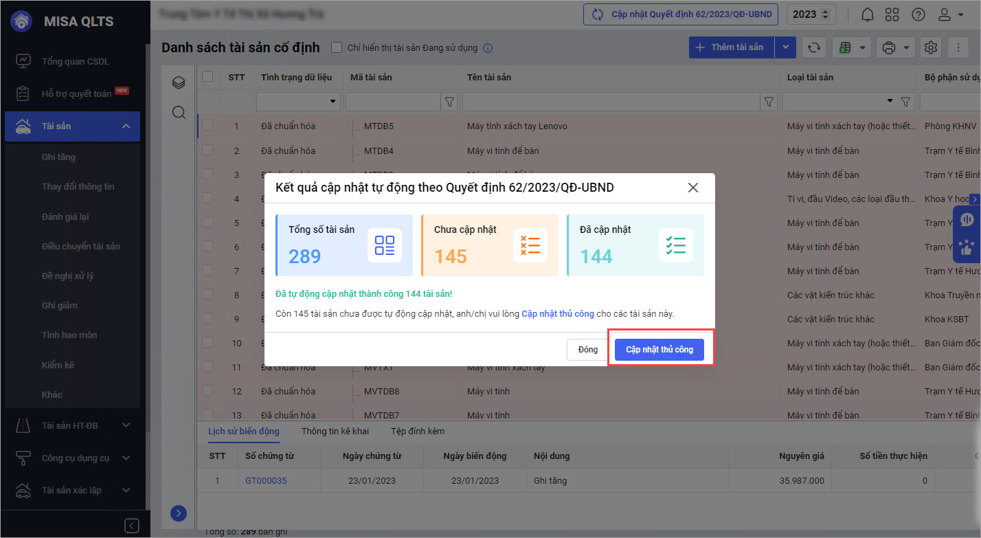 Bước 3. Phần mềm hiển thị tổng số tài sản đã cập nhật, tổng số tài sản chưa được cập nhật. Với các tài sản chưa được cập nhật anh/chị có thể cập nhật thủ công bằng cách chọn Cập nhật thủ công anh/chị xem hướng dẫn Cập nhật thủ công tại đây.