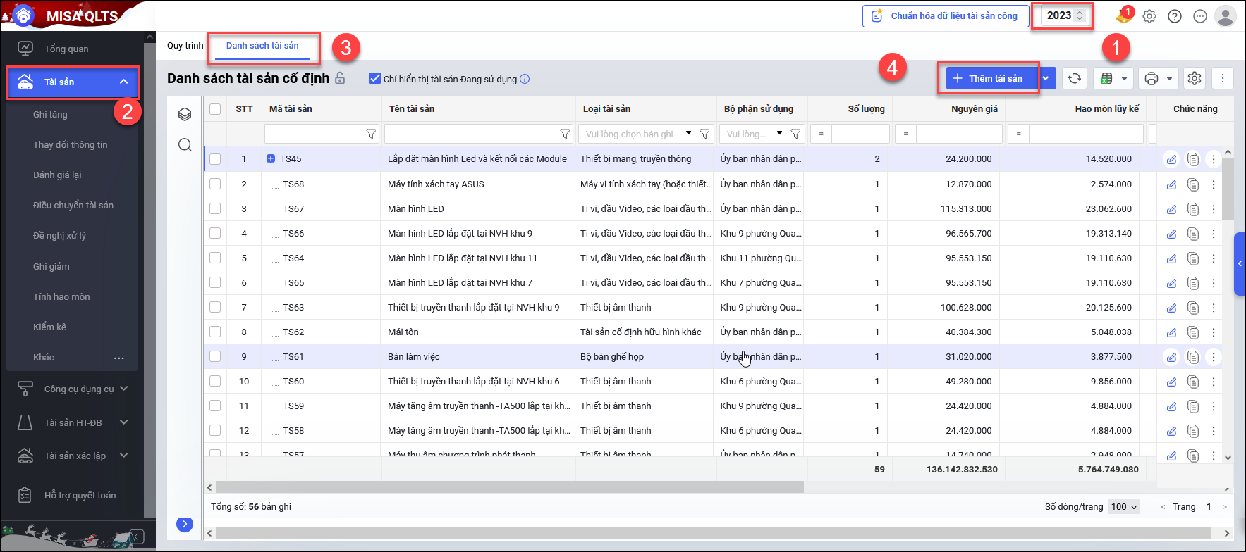 - Tại menu Tài sản bên trái\ chọn tab Danh sách tài sản\ nhấn Thêm tài sản.
