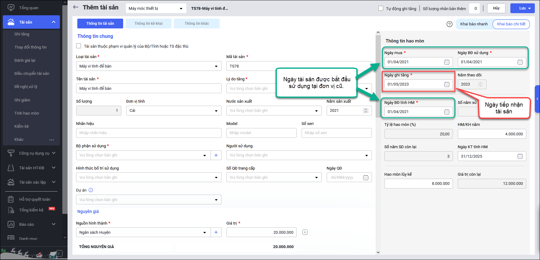 - Ngày ghi tăng: Ngày tiếp nhận tài sản.