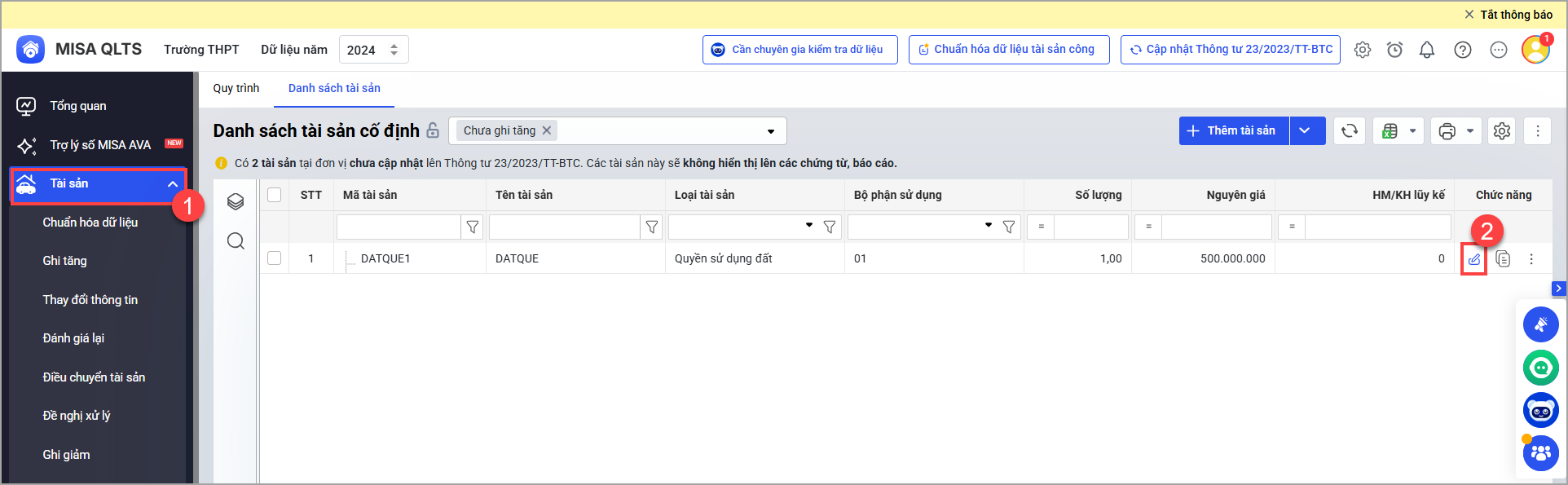 1. Vào Tài sản/Thêm tài sản, nhấn vào biểu tượng chiếc bút tại tài sản cần thay đổi thông tin