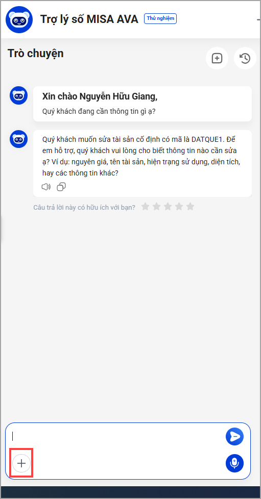 2. Tại màn hình Trợ lý số MISA AVA, anh/chị nhấn vào nút + để tải lên các tài liệu hình ảnh liên quan tới tài sản để MISA AVA hỗ trợ trích xuất và điền nhanh thông tin