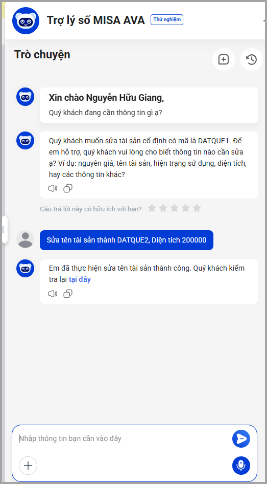 Trợ lý số MISA AVA hỗ trợ Cán bộ QLTS thêm/sửa nhanh thông tin tài sản