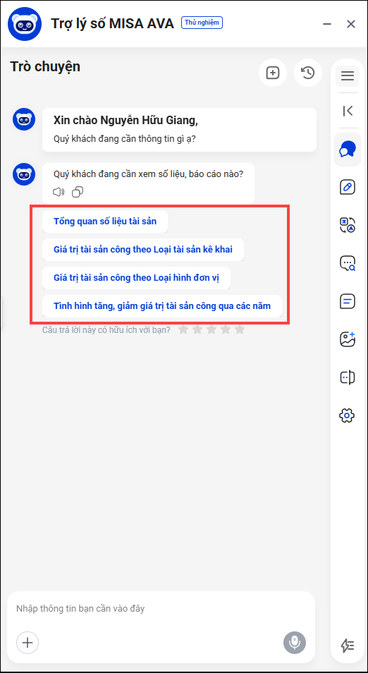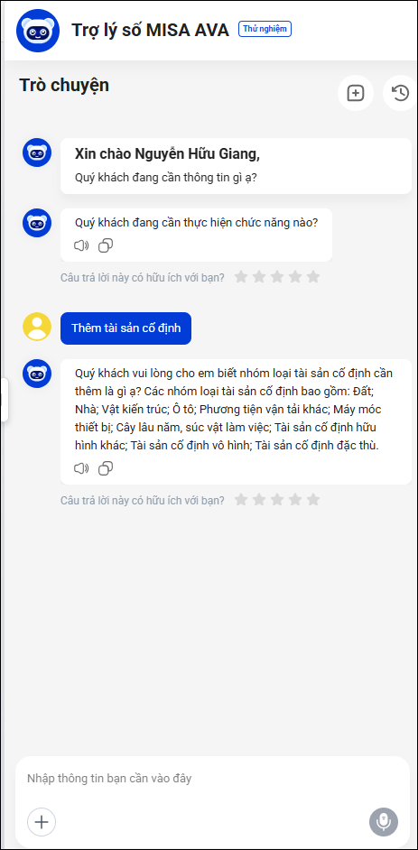 - Anh/chị nhập chức năng vào khung chat để MISA AVA hỗ trợ