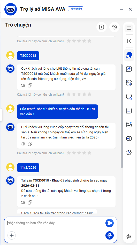 - Anh/chị nhập mã tài sản trong khung chat với MISA AVA. Sau đó làm theo hướng dẫn của AVA để thực hiện chỉnh sửa thông tin tài sản