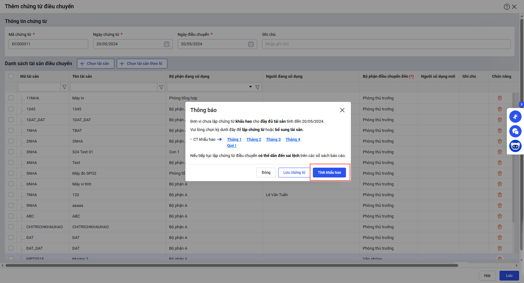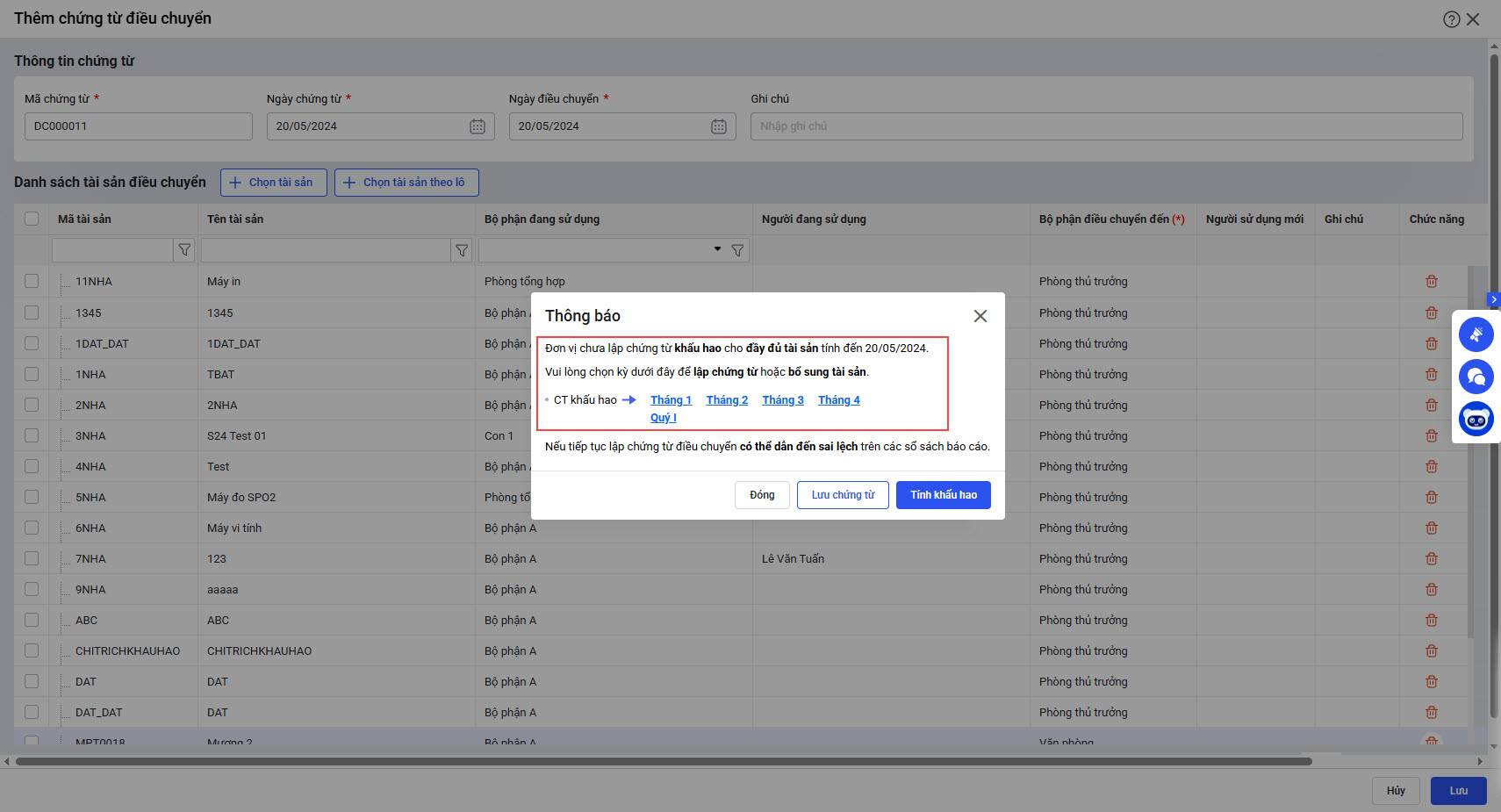 Khi chứng từ điều chuyển tài sản được lập trước kỳ tính khấu hao, phần mềm không cho phép thêm tài sản vào chứng từ tính khấu hao. Người dùng không thể thực hiện tính khấu hao cho tài sản, và buộc phải xóa chứng từ điều chuyển mới có thể tính được khấu hao
