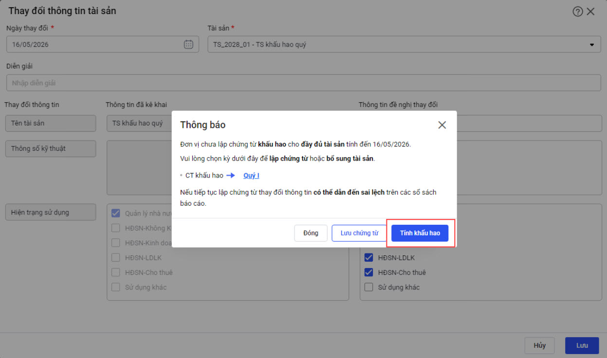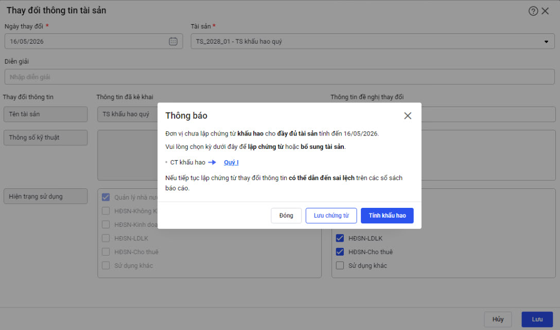 Tại menu Tài sản\Thay đổi thông tin: Khi lập chứng từ thay đổi thông tin nếu tài sản chưa được tính đủ khấu hao cho đến Ngày biến động thì phần mềm hiển thị cảnh báo