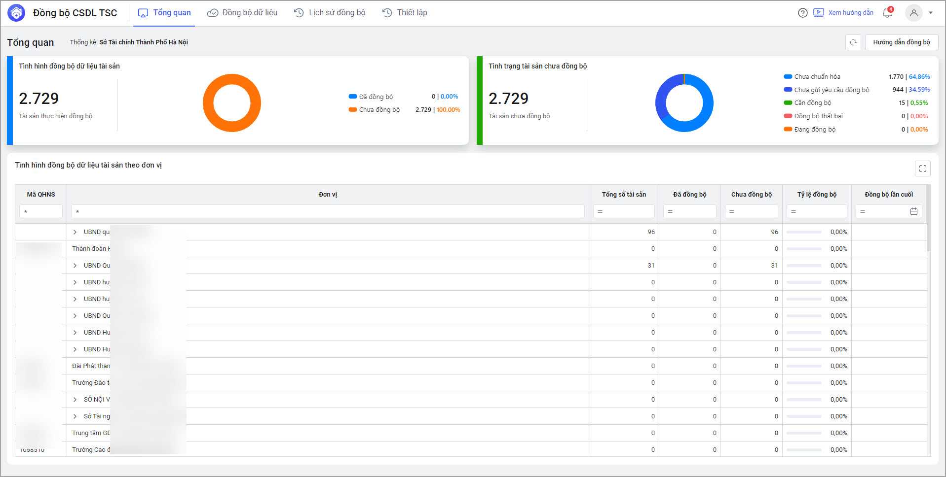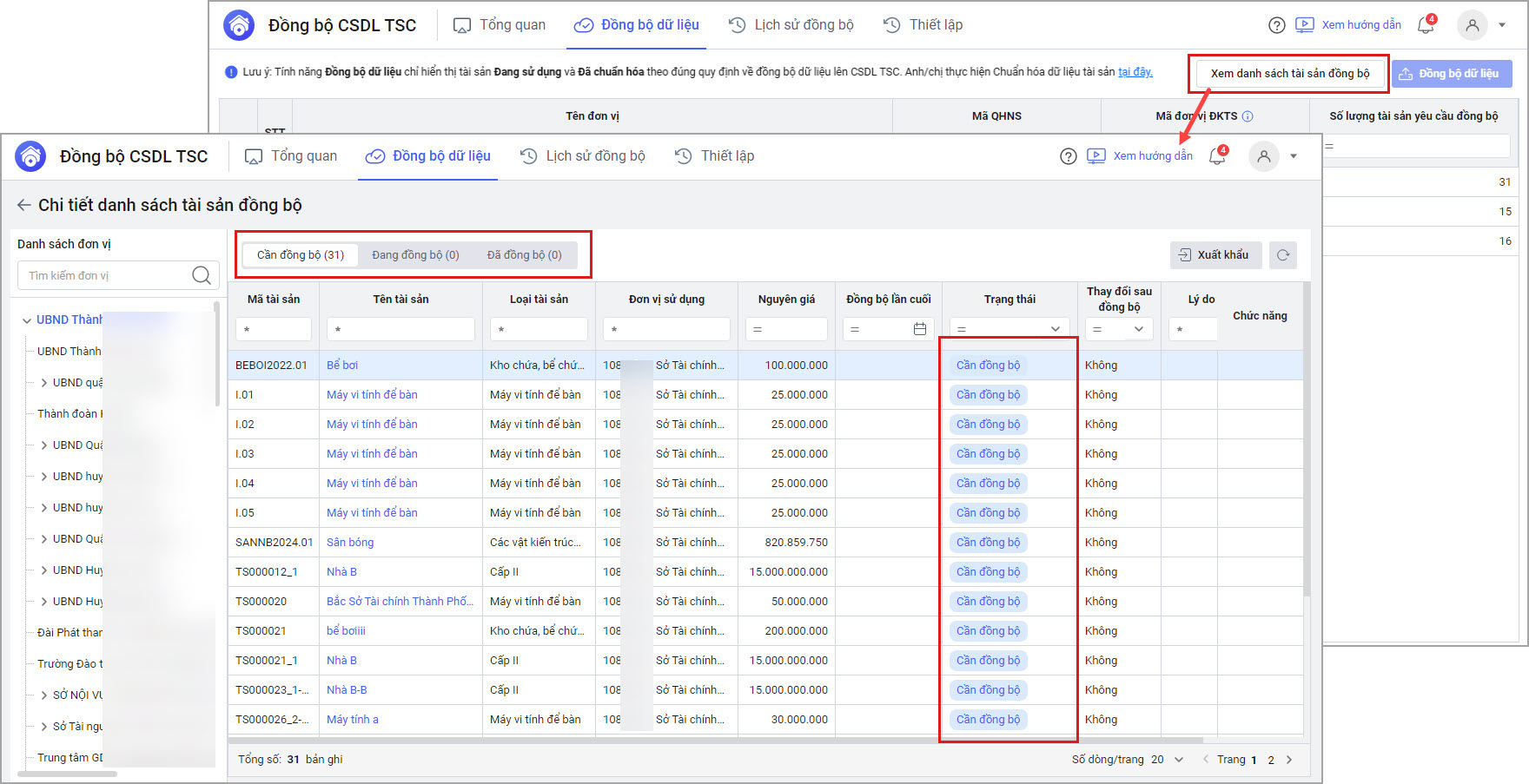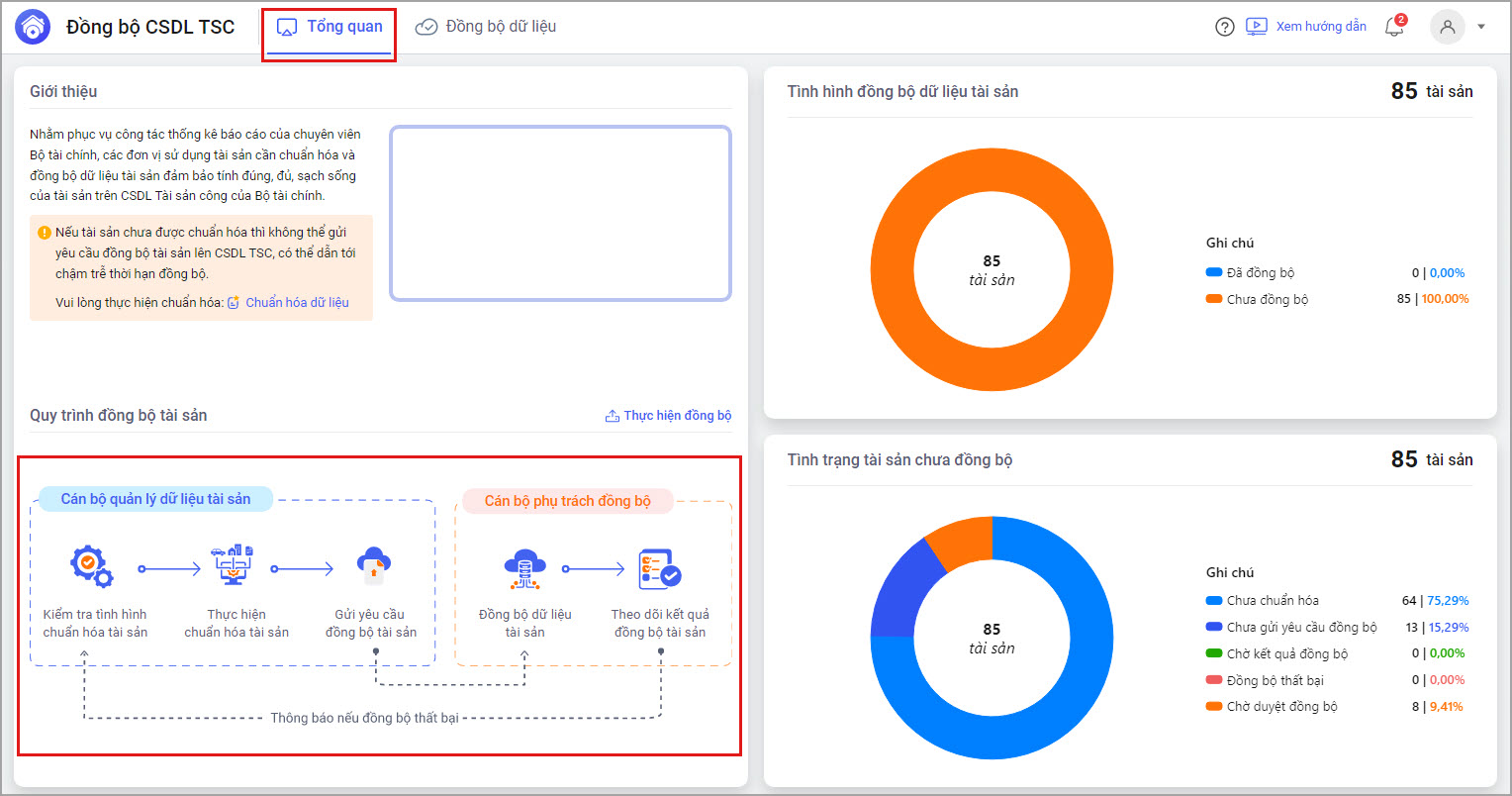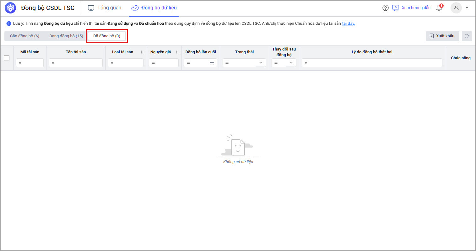 Lưu ý: Trước khi tiến hành đồng bộ dữ liệu lên Cơ sở dữ liệu Quốc Gia, anh/chị đảm bảo đã kiểm tra và chuẩn hóa các thông tin của tài sản theo hướng dẫn chi tiết tại đây.