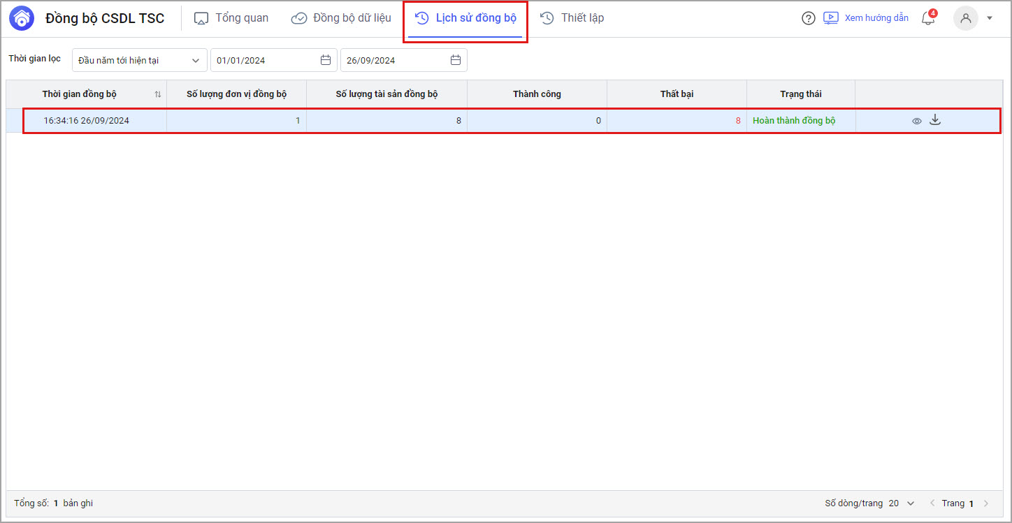 Kết quả chi tiết sẽ được hiển thị chi tiết tại Xem danh sách tài sản đồng bộ