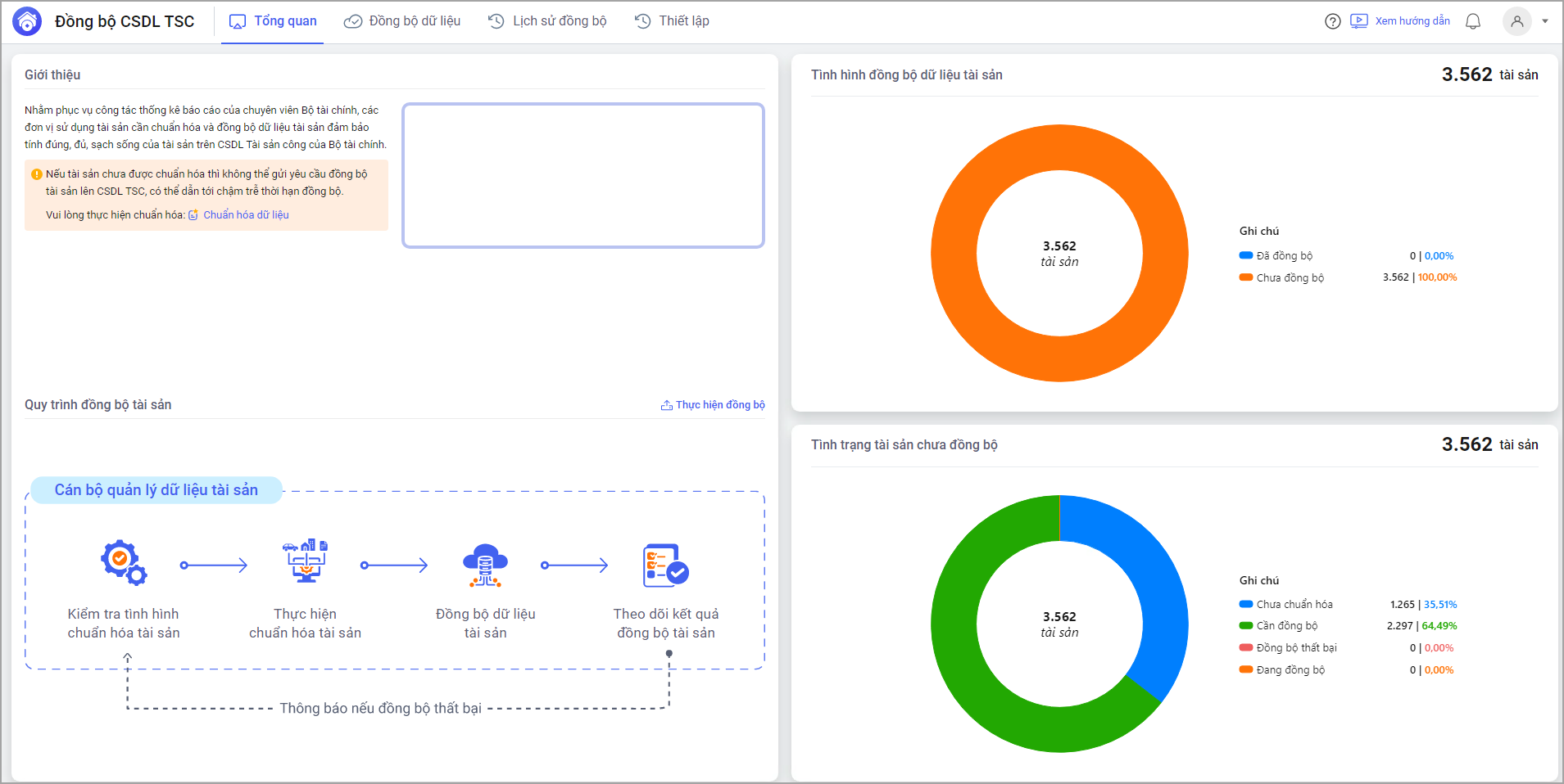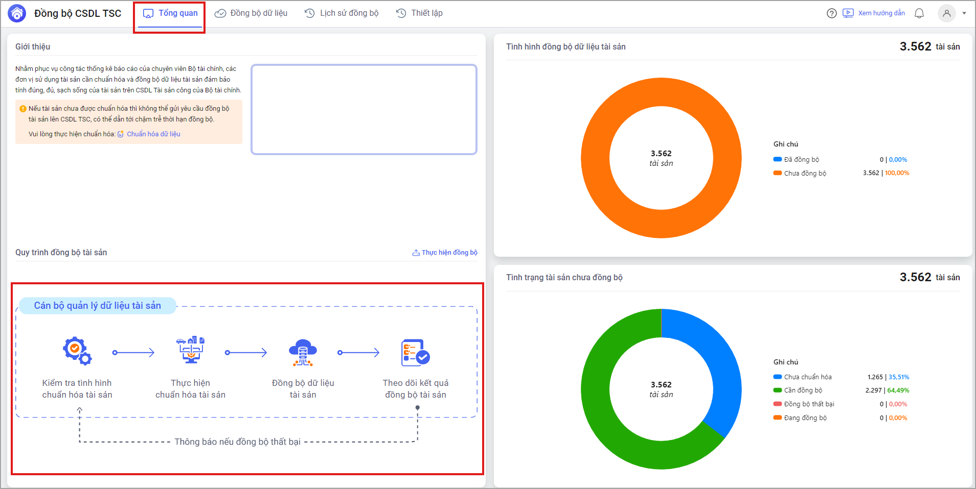• Tại mục Tổng quan cán bộ QLTS có thể xem quy trình đồng bộ tài sản lên Sở tài chính