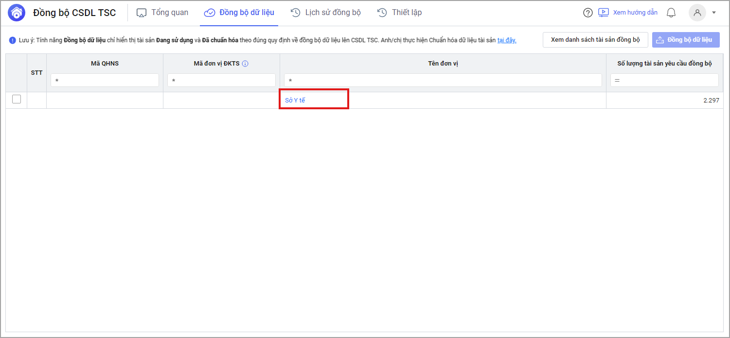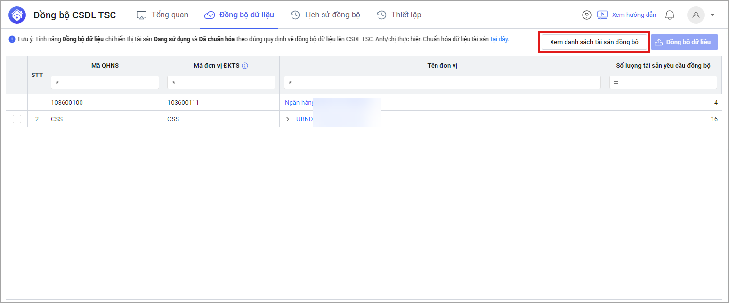 • Để xem chi tiết danh sách tài sản cần đồng bộ, Cán bộ QLTS chọn vào đơn vị hoặc chọn Xem danh sách tài sản đồng bộ