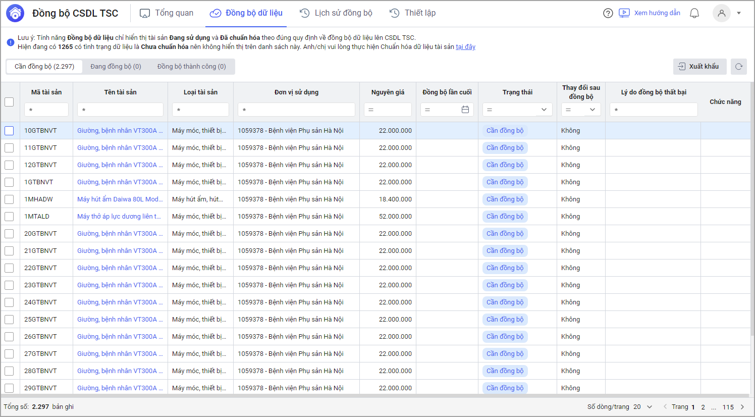 Lưu ý: Trước khi tiến hành đồng bộ dữ liệu lên CSDLQG, anh/chị đảm bảo đã kiểm tra và chuẩn hóa các thông tin của tài sản theo hướng dẫn chi tiết tại đây.