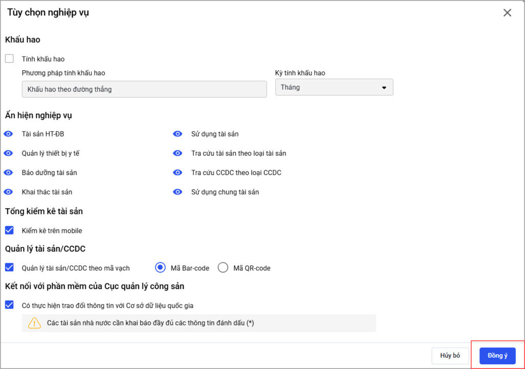 Giúp đơn vị thiết lập những nghiệp vụ sử dụng như: Tính khấu hao, ẩn hiện nghiệp vụ, quản lý thành tiền khi chuyển tài sản thành CCDC, …