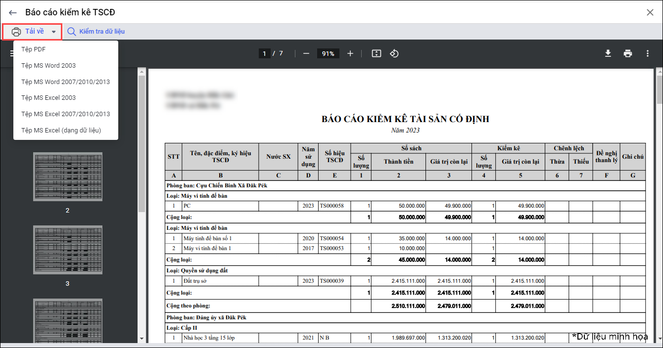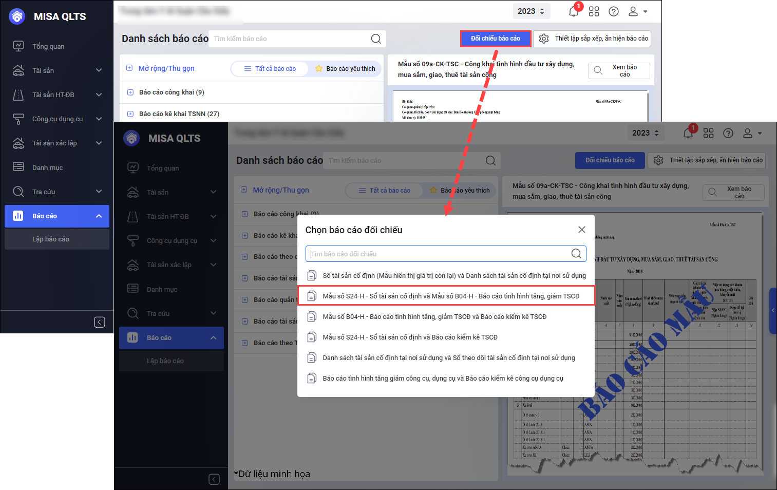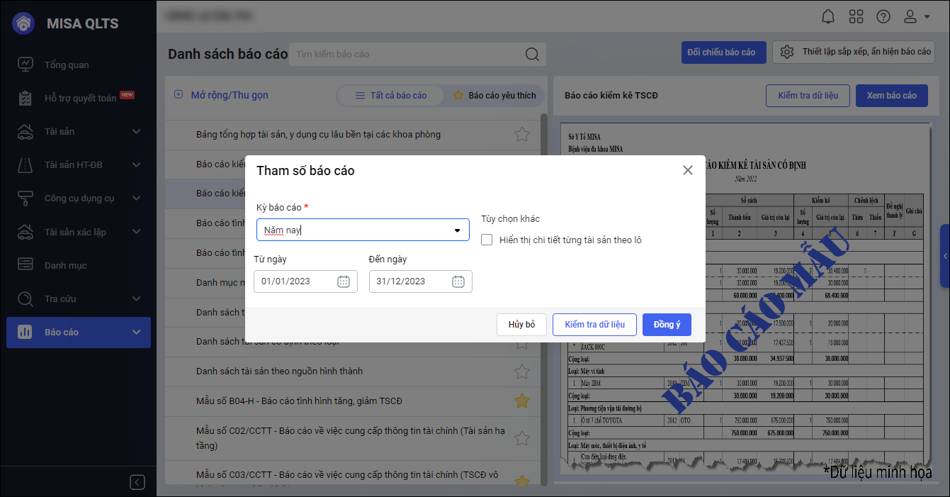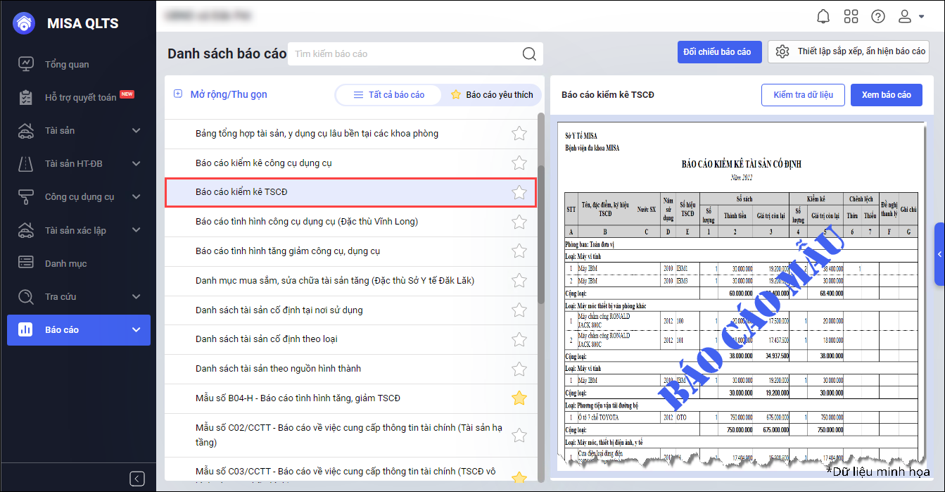 Trước khi xem và in báo cáo, anh/chị cần thực hiện rà soát lại xem đã khai báo đủ tài sản, nhập đủ phát sinh (chuyển loại, ghi giảm..), đã làm hao mòn, kiểm kê chưa. Anh/chị cần hoàn tất các thao tác này trước khi xem để báo cáo lên số liệu chính xác, đầy đủ.